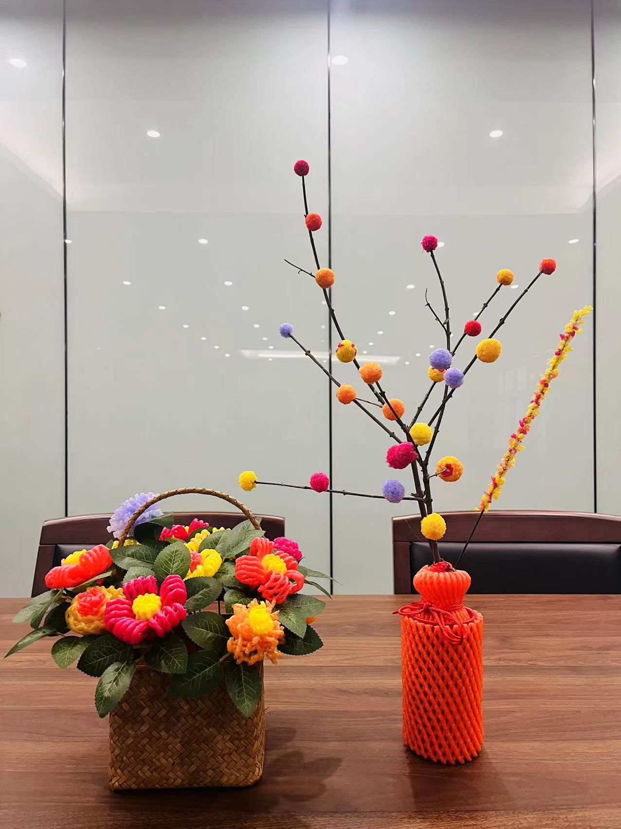 橙色的花束、金黄色的花蕊,团成一束,一年四季都保持着盛放的姿态……这些不会凋落的“花朵”不是自然生长,而是由镇电社区“别样红”阿姨手工坊利用各种颜色的水果泡沫网套制作而成的假花。