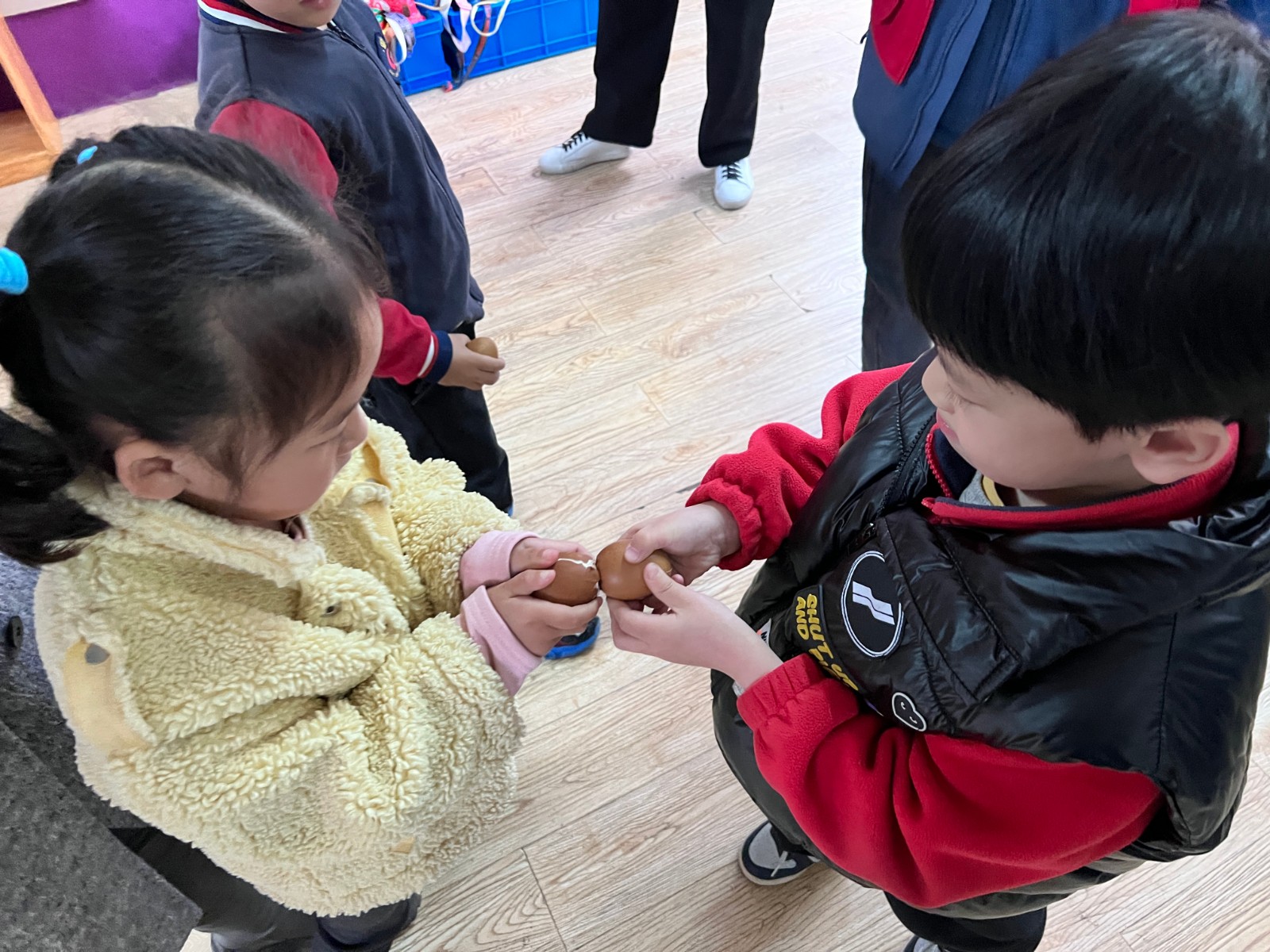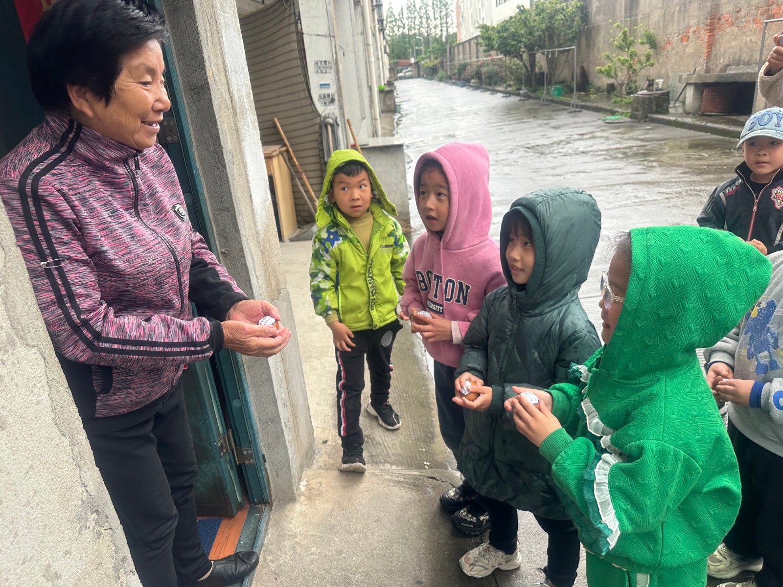 俗谚称,立夏胸挂蛋,孩子不疰夏。在立夏前夕,石塘下社区的网格员为幼儿园的小朋友们送来了立夏蛋和可爱的兔子蛋套。网格员首先向孩子们讲解了立夏的来历和传统习俗,了解属于立夏的独特风俗,并传授了斗蛋的独家秘笈。孩子们衣襟前挂着蛋套,三五成群,斗蛋为戏,蛋头对蛋头,蛋尾击蛋尾,以蛋壳坚而不碎为赢,最后选出了蛋中“大王”。