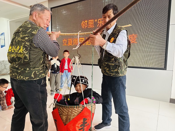 “立夏称人轻重数,秤悬梁上笑喧闺。”活动以称重开场,退役军人王兆林与张仁斐用扁担挑起装有小朋友的箩筐,通过传统方法给小朋友称体重,一拨、一稳、一看,报出小朋友的体重并赠予相应的吉利话。这让在场的少数民族小朋友新奇不已、争相参与。