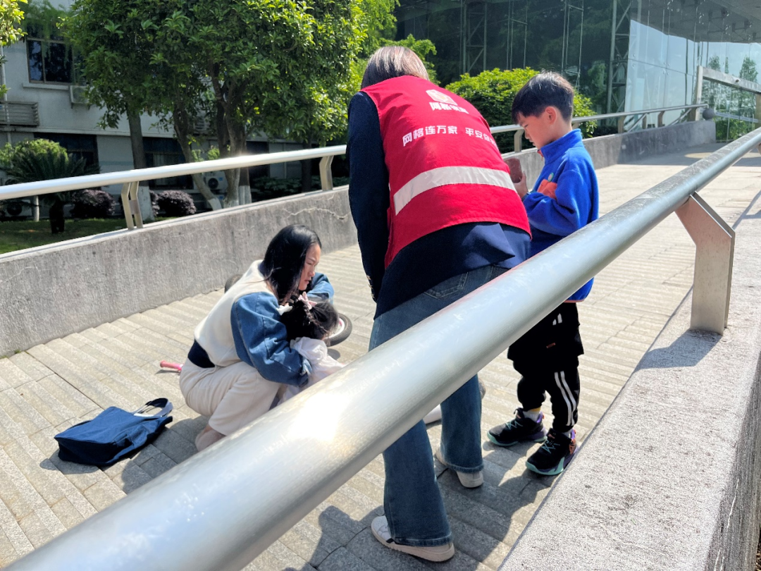 5月3日,正值五一劳动节期间,石化三建社区网格长赵欣敏在例行店铺消防安全巡查的路上,突然发现一名小朋友骑着自行车从一个比较陡的斜坡上冲下来,狠狠的摔倒在地上,头破血流,情况十分危机,网格长连忙上前查看情况,小孩的哭声也立即引来了正在斜坡另一边聊天的家长。赵欣敏说:“你是女孩的妈妈么?她从上面的斜坡摔下来了,摔得挺严重的,要不要上医院看看”,于是,网格长赵欣敏抱着小孩,孩子妈妈用衣服按着出血的伤口,两人一路跑去附近的镇海二院。到医院后,赵欣敏帮忙照看小朋友,女孩妈妈赶忙去办理挂号等手续。医生检查后因头上伤口较深,范围较大,需要进行清创缝合。听着女孩撕心裂肺的哭声,妈妈自责不已,赵欣敏心里也非常担心,陪在女孩的妈妈身边安慰她。女孩妈妈连连向网格长道谢:“今天真是谢谢你,幸好有你帮忙才能这么快赶到医院”,网格长赵欣敏说:“没关系没关系,其他人看到了也会上前帮忙的,小朋友正是活泼好动的年纪,以后危险的地方多多注意”。