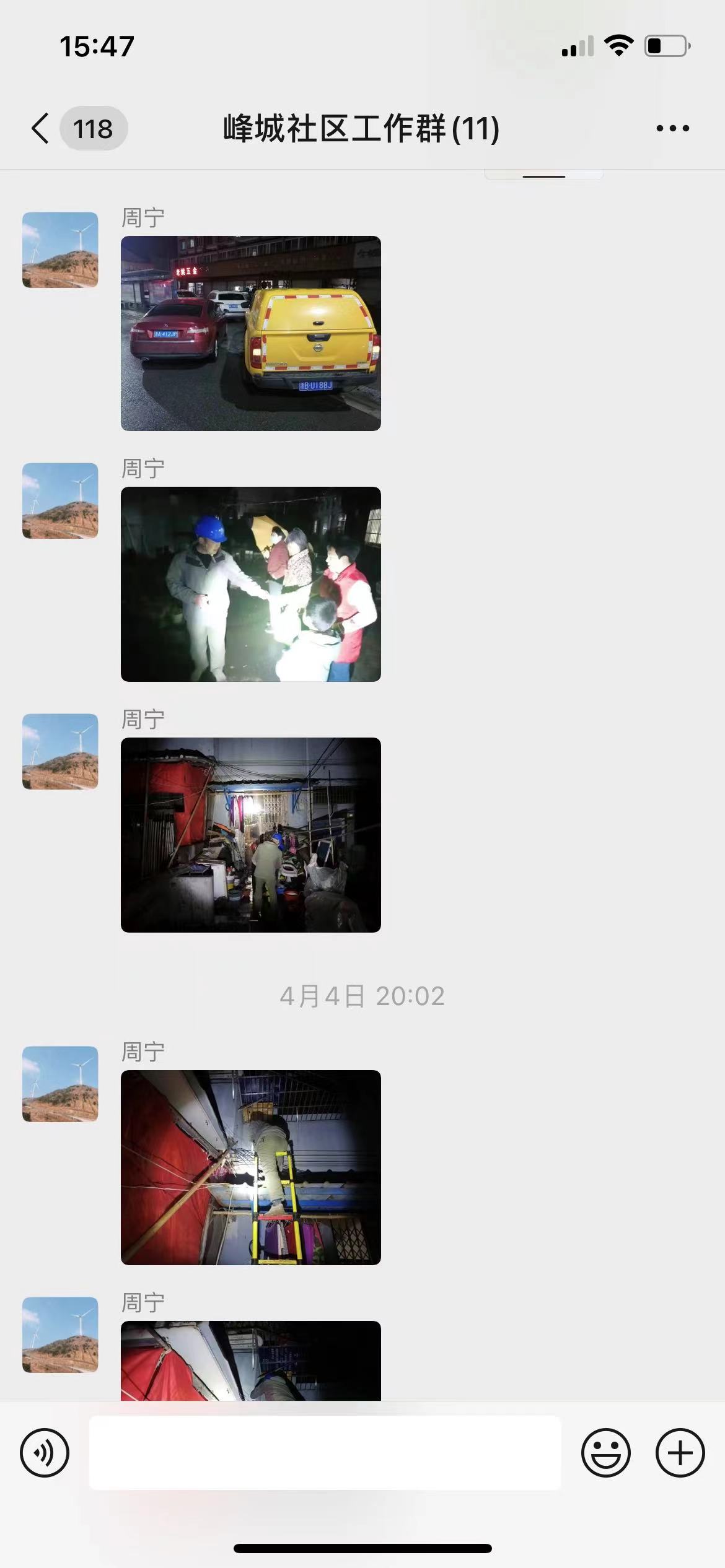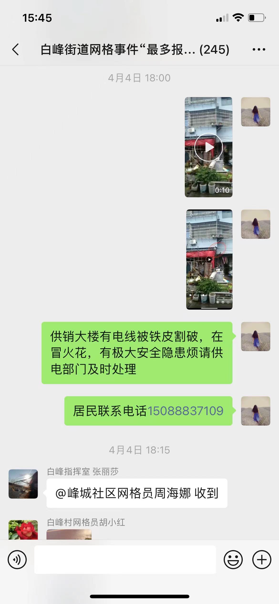 2023年4月4日晚,微网格8群供销大楼居民反映户外电线被防盗窗铁皮割破,当天风雨交加,电线破损处冒着火花,存在极大安全隐患。微网格长迅速在群内响应,将此情况上报到街道网格事件处置群和社区工作群,街道指挥中心立即将事件分派给仑东供电所,供电所的师傅冒着风雨连夜进行了抢修,社区负责人和网格员也赶到了现场安抚居民情绪,并全程跟进事件处置,通过各方努力,及时消除了安全隐患。