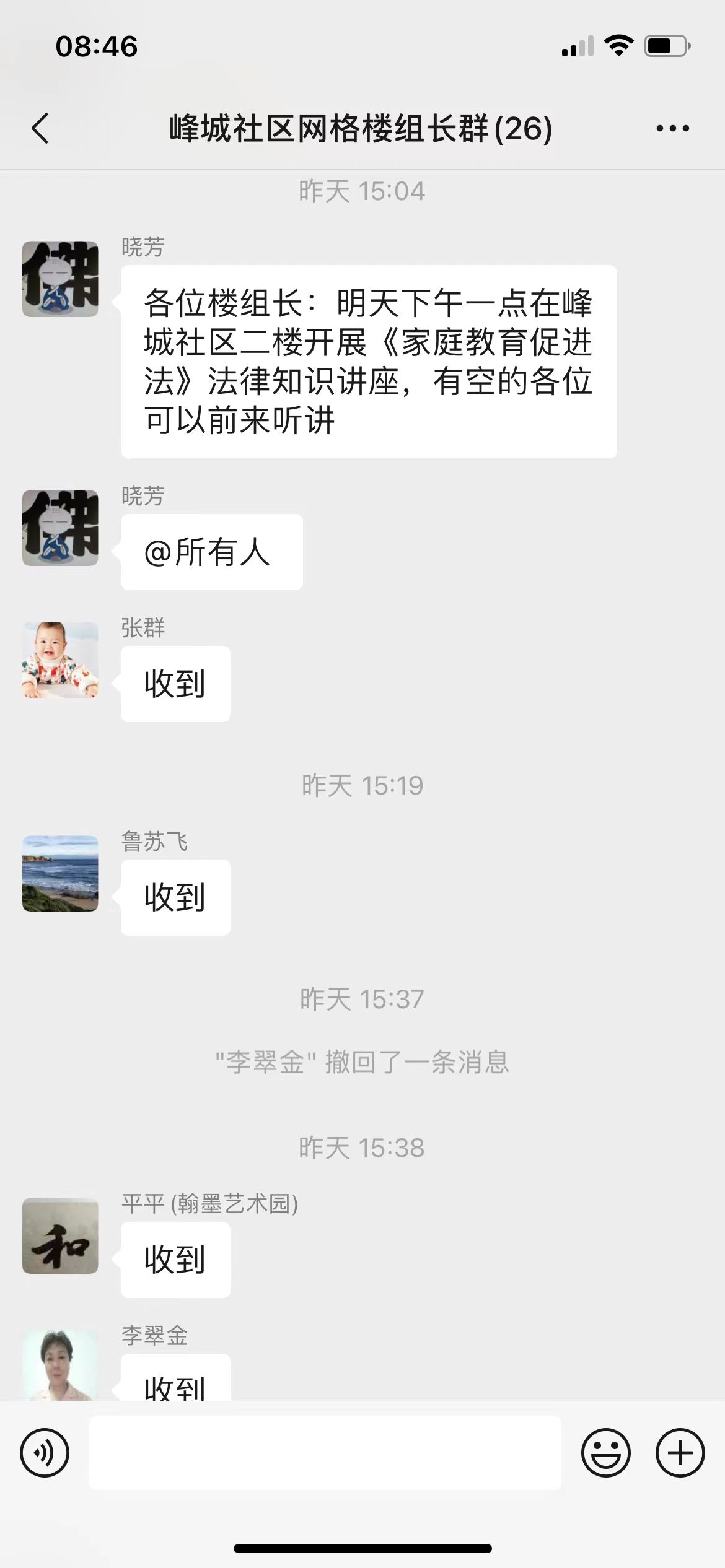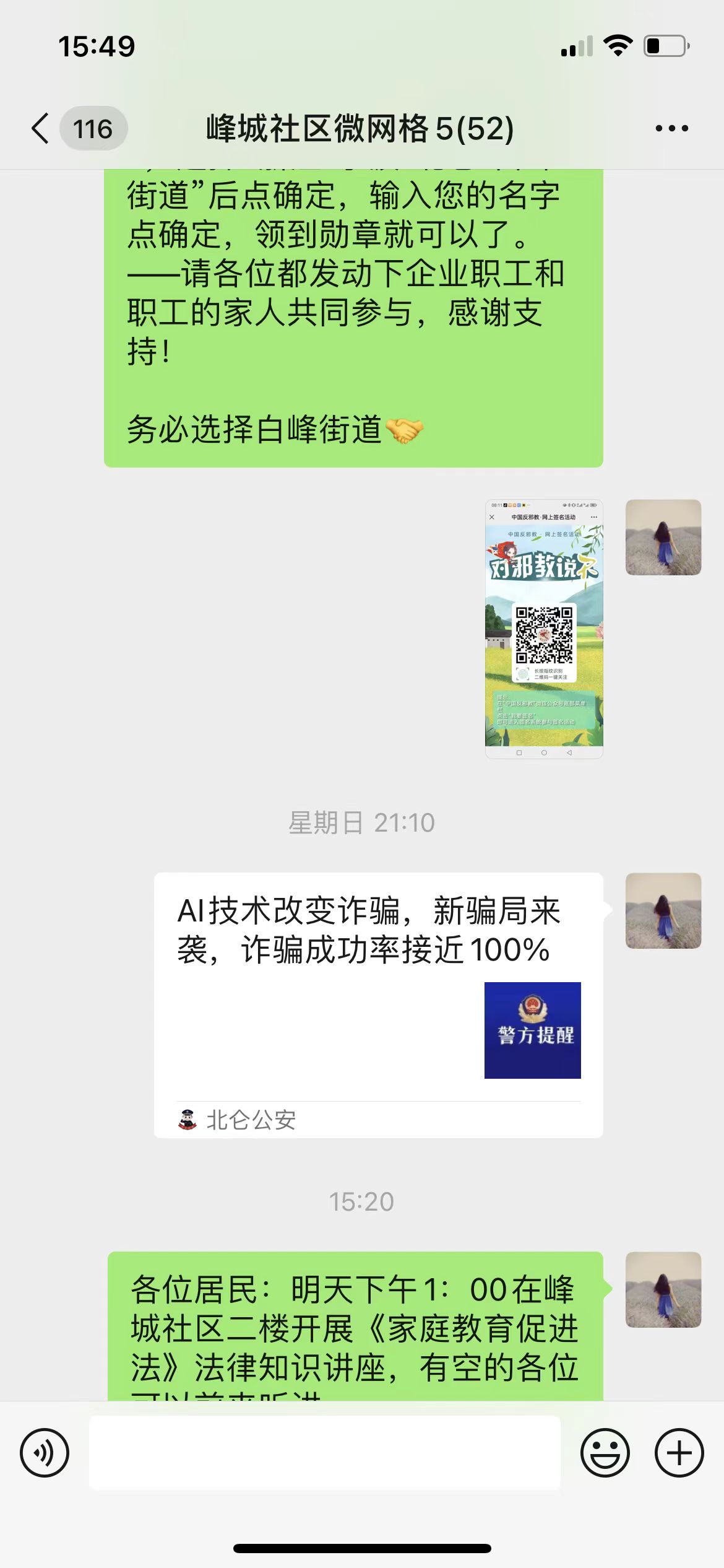 5月初微网格长在群里发布了开展《家庭教育促进法》法律知识讲座的通知,不到半个小时,报名参加的居民就达30余人。除此之外,微网格长还会在群里定期推送反诈骗、反邪教、交通安全、消防安全等相关防范知识。
