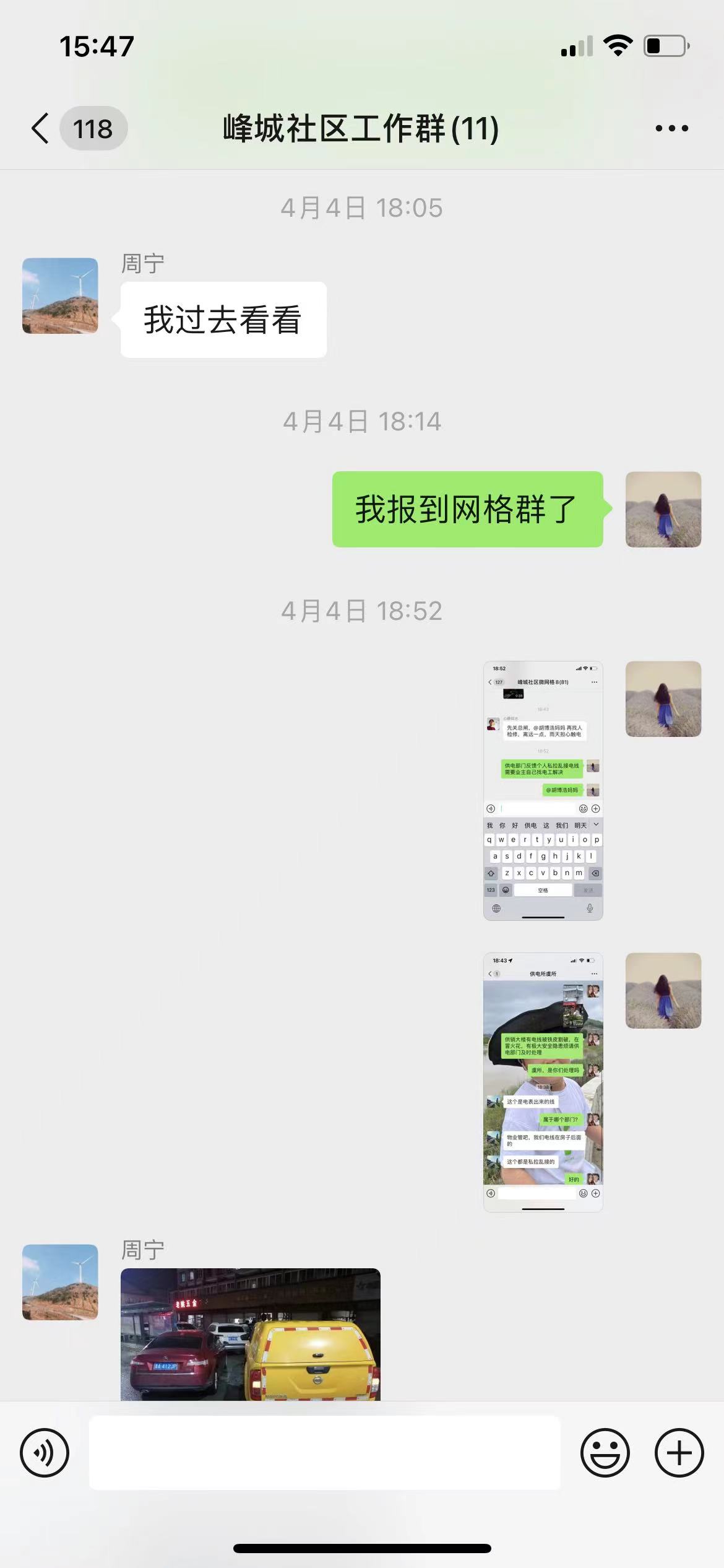 峰城社区微网格群在辖区形成了上情下达、互动互通的群众微信网络,用“红马甲速度”,立足“微网格”、融入“小服务”、发挥“大作用”。峰城社区网格长表示:面对微网格群内居民的诉求、建议、线索,我们能够快速回应,居民们对我们的工作也越来越满意,下步峰城社区将持续推进“微网格”建设,做细做实基层网格,进一步疏通基层治理“微循环”,真正将网格微信群打造成为最大限度引导居民积极参与社区共建、共治、共享的有效载体。