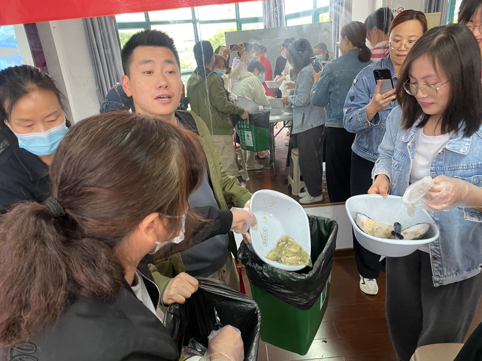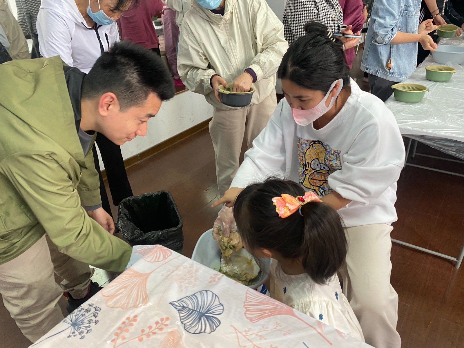 活动中,妈妈们围坐在一起,准备开蚌取珠,为自己或者妈妈亲手做个小首饰。动手之前,志愿者向大家仔细讲解了厨房中哪些属于厨余垃圾,哪些属于其他垃圾,讲完拿着一只大河蚌询问坐在妈妈怀中听得一脸认真的小姑娘:“小朋友,你知道这个河蚌的壳,用完的壳要扔在哪个桶呀?”小姑娘歪着脑袋想了想,在妈妈的提醒下指了指黑色的垃圾桶。“对,贝壳的属于其他其他垃圾哦,那分离出来的蚌肉属于什么垃圾呀?”“厨余垃圾!”小姑娘怯生生地说。“太棒了,刚刚听得很认真哦,那你知道开出来的珍珠要丢在哪个桶么?”“珍珠要戴在妈妈的脖子上!”小姑娘天真的回答逗乐了在场的每个人。