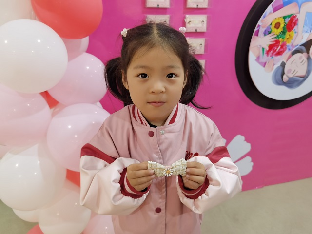 活动现场布置异常温馨甜蜜,粉红色的背景墙上挂满了各种可爱造型的梦幻气球和五颜六色的彩带。“爸爸,妈妈喜欢粉红色,我们给她做个粉色蝴蝶结发夹好不好啊?”“好的啊,再给发夹装饰上白色珍珠,妈妈带上肯定漂亮!”现场,孩子和爸爸一起,在文化站工作人员王慧琳老师的指导下手工做发夹,送给妈妈一份美丽,希望妈妈永远年轻,永远有少女感。