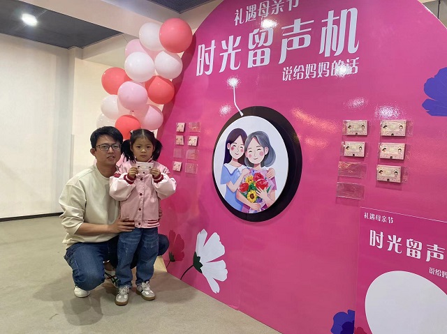 “妈妈,我爱你!”“老婆,你辛苦了!感谢你为这个家所付出的一切!希望你越来越年轻,越来越美丽!”柴桥幼儿园小二班王锦妍小朋友正和爸爸一起从背景墙上取下磁带,为妈妈录下最暖心的话语,送上母亲节的祝福。