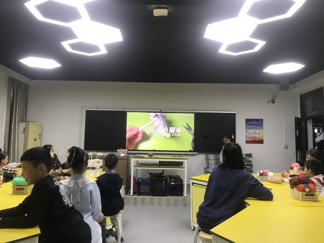 接着,新建小学的汪冰老师,承接旧物利用理念,为孩子们带了一堂有趣的亲子手工课——玩转毛线。《玩转毛线》课程在2022年被评为余姚市第七届精品拓展课。本次活动制作的小雨伞是教材中比较简单且有趣的一课,非常适合小学中低段的孩子。汪老师首先展示了她的一些毛线小作品,然后教孩子们制作小雨伞。先从伞的骨架开始,再进行伞面的编织,加上毛线的色彩以及伞面细节的搭配,最后制作出好看的毛线小雨伞。