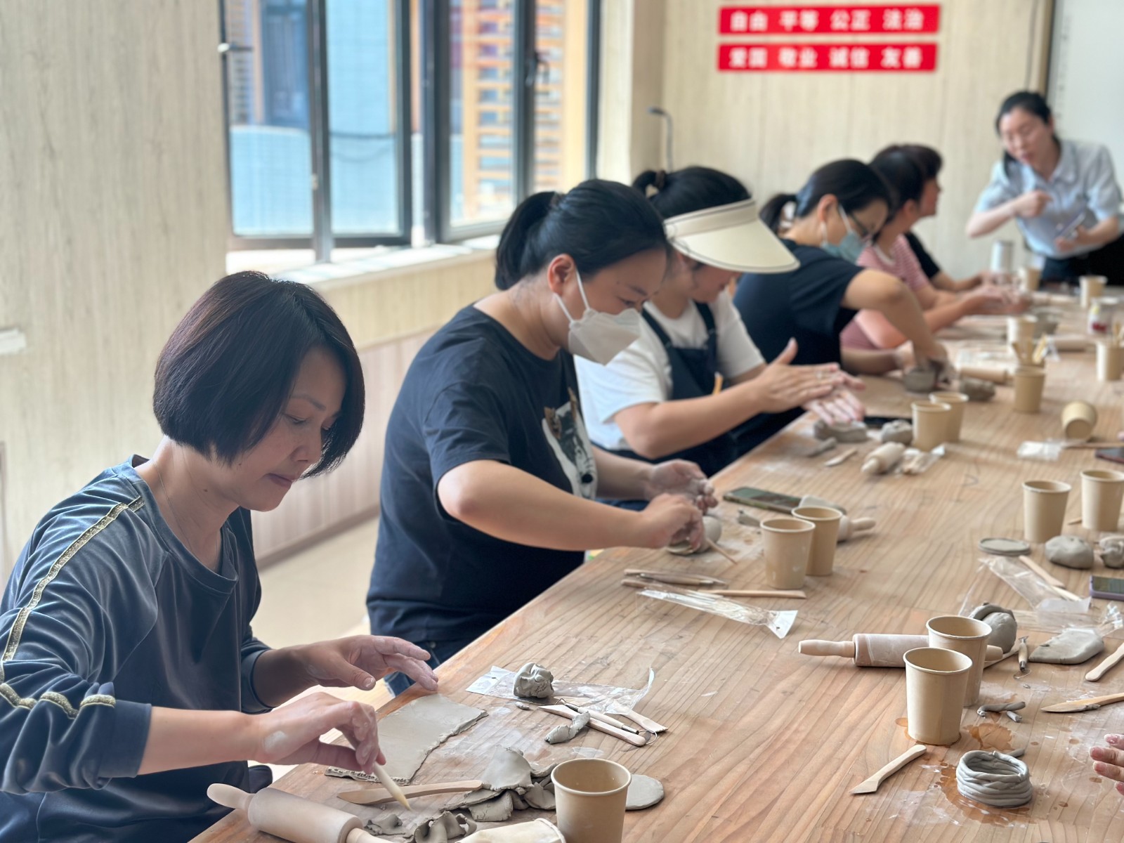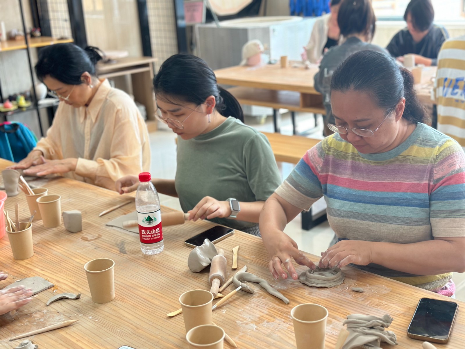 据了解,此次体验课主要内容为学习制作花瓶、笔筒、水杯等简单的陶艺作品。活动开始,老师对陶艺文化的渊源、发展、演变进行了详细讲解,让学员们对陶艺发源、历史进程以及陶艺制品的塑形、烤制等工序有了大致的认知。随后,老师教导大家对陶泥进行手工塑形,并详细地讲解了搓条、拼接、塑形等方法,着重强调了制作花瓶、笔筒、水杯的手法和注意事项。老师演示完成后,学员们开始有条不紊的摆弄着手中泥料,虽然一开始大家觉得无法下手,但在老师的细心指导下,逐渐掌握了方法,把自己的作品一步步完善。现场大家围坐在一起,一边动手制作自己的陶艺制品,一边热情交流,在互帮互助的过程中,一件件精美的作品在指尖绽放,活动现场其乐融融。