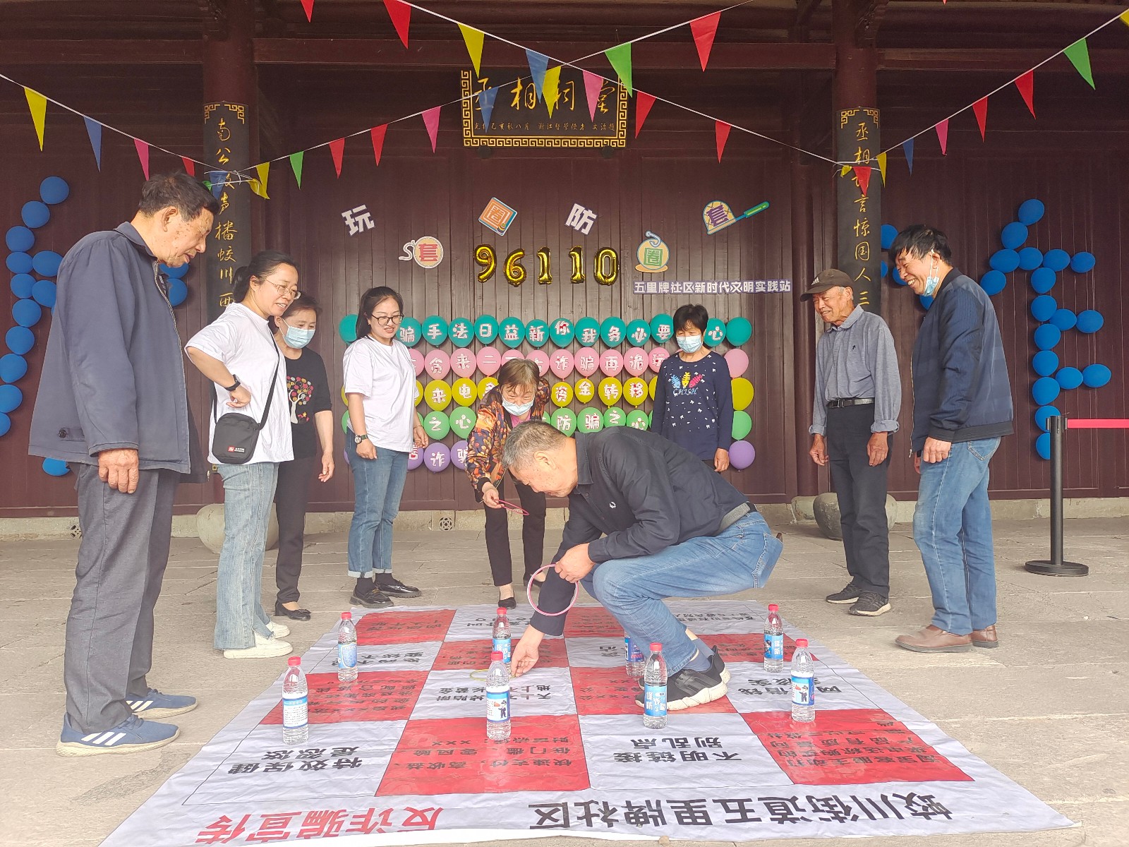 活动中,居民们在网格长的指导下,对着地上的反诈地图开展套圈游戏,并回答防诈问题。一场活动下来,大家都玩得不亦乐乎,比技巧,拼运气,在充满欢声笑语的游戏中,潜移默化地提升了居民防范诈骗意识。同时,网格长还在游戏过程中向大家科普反诈骗知识,通过向居民发放宣传册,警民联系卡的形式耐心细致地给居民讲解如何识骗防骗,在居民心中织成了一张越来越密实的“防护网”。