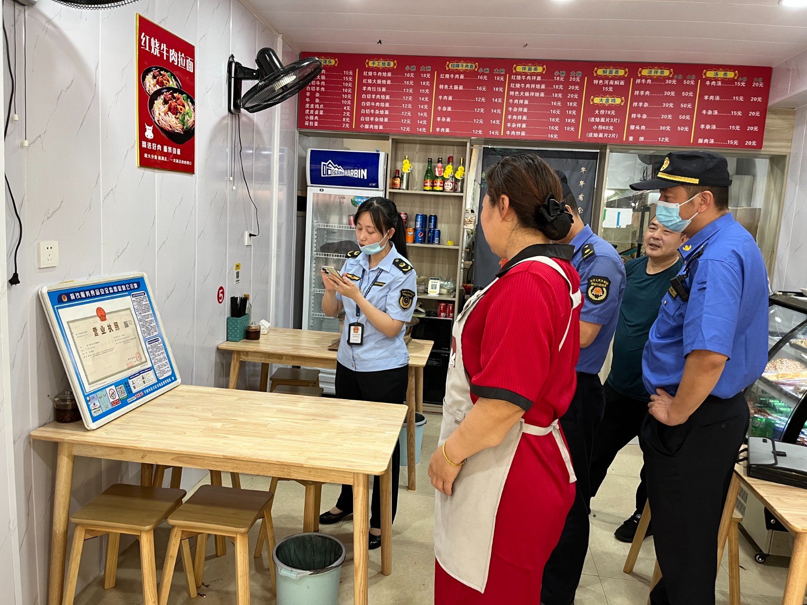 当食品安全小分队走进品佳小吃店,店家吓了一跳,连忙问道:“不会有投诉吧?”青墩社区社区食品安全包保员解释道:“没有投诉,这次我们和北仑区市场监督管理局、北仑区综合行政执法局执法人,以及小港街道街道食安办工作人员一起来检查一下,顺利的话一会就好了,有问题的话及时整改。”执法人员们根据清单对健康证、营业执照、后厨卫生、油烟排放等事项逐一检查,并上传系统。“我们开店的也不容易,有的时候刚整改好这个问题,过段时间另一个部门又检查出别的问题,很影响我们做生意,消费者不知情的话还以为我们店有什么大问题。这次检查就很好,有问题一次性和我们说嘛,我们也会配合整改,节省时间,检查整改完我也放心做生意。”老板满意地说。