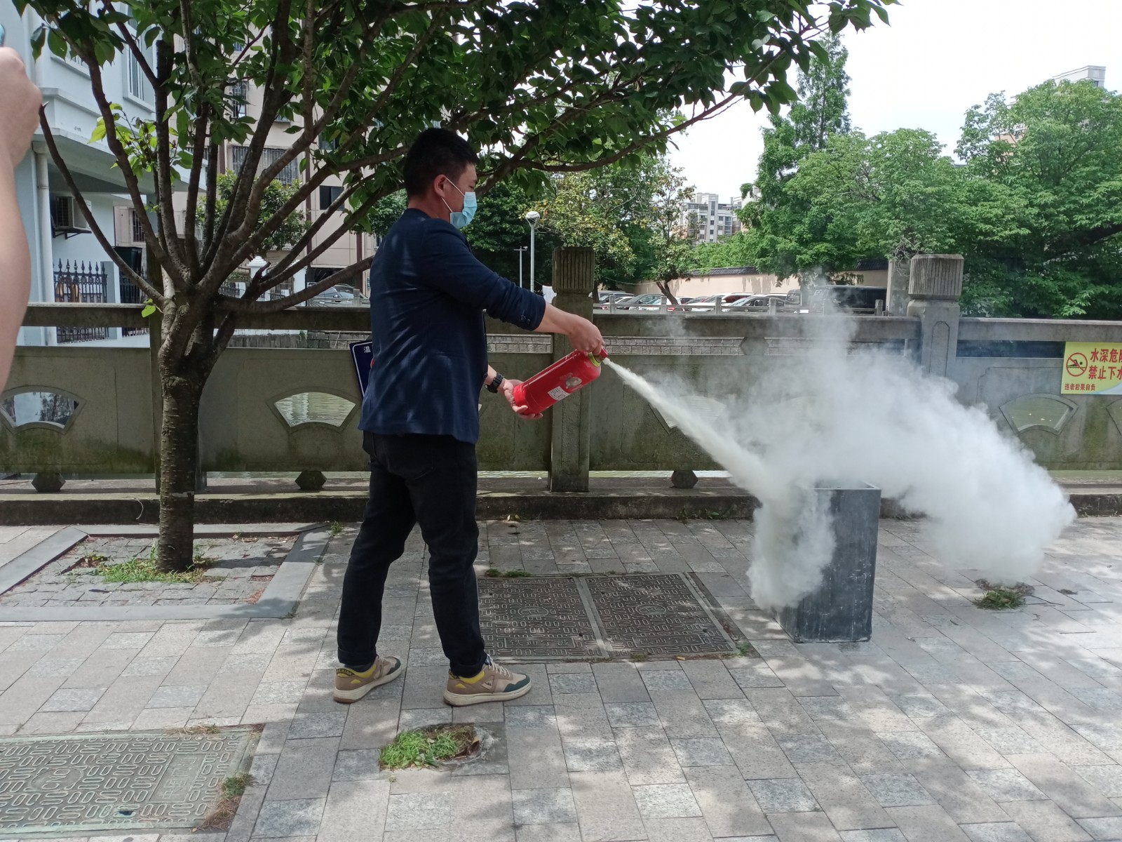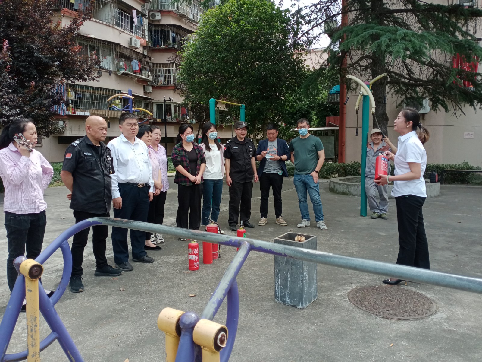 演练现场,首先由永成物业经理为大家详细讲解了干粉灭火器的使用技巧和注意事项,并手把手现场进行示范。大家纷纷凑到跟前,仔细聆听。最后,每个人都按照操作步骤,轮流上前操作。