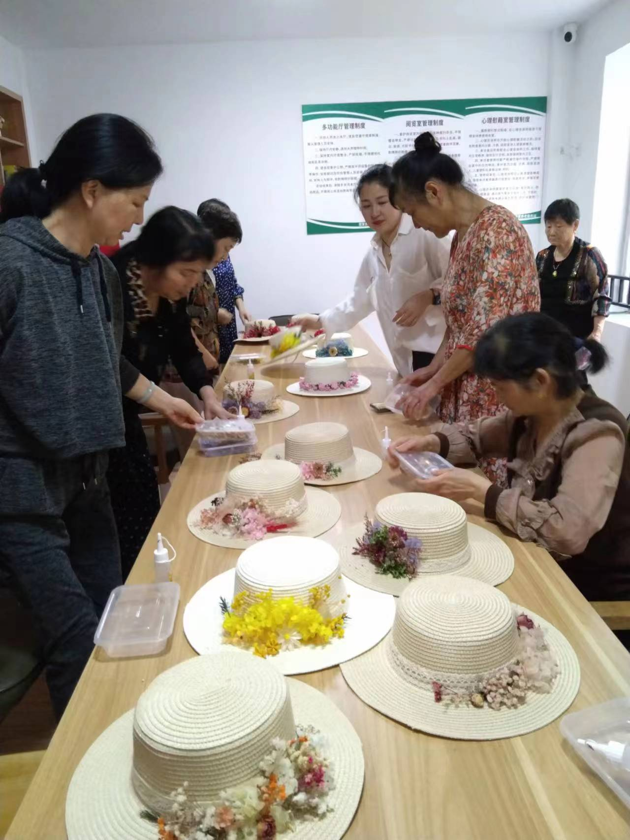 为丰富辖区老年人的业余生活,长兴社区联合第三方机构来社区居家养老中心开展巧手做草帽活动。活动开始后,老师首先讲解了草帽制作的步骤跟要点,然后现场演示了如果用胶水把五颜六色的干花等物巧妙的粘在草帽上,做成一顶漂亮的时尚草帽。等老师讲解完之后,阿姨们就亲自动手制作起来了,她们根据老师的讲解,选择自己喜欢的干花,组合成漂亮的图案,然后用胶水把它们粘在草帽上。她们一边做,老师也时不时的在旁边搭把手。制作期间也充斥着阿姨们的欢声笑语,制作完成后,阿姨们拿着自己制作的草帽也拍摄了合照。本次活动很成功,阿姨们都很满意,也很感谢社区组织的本次活动。