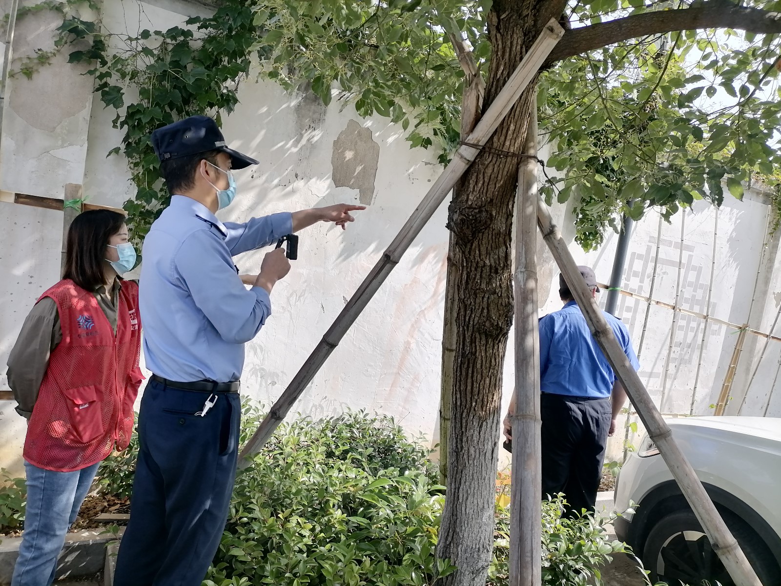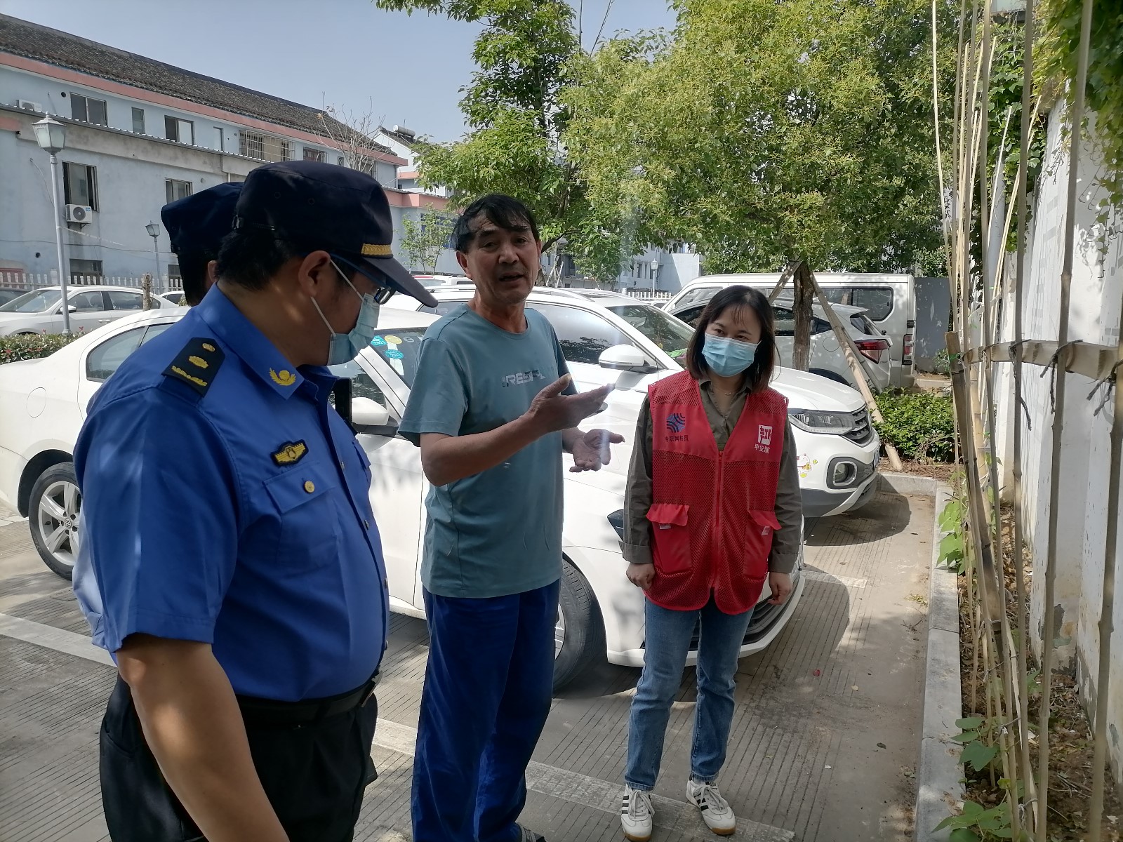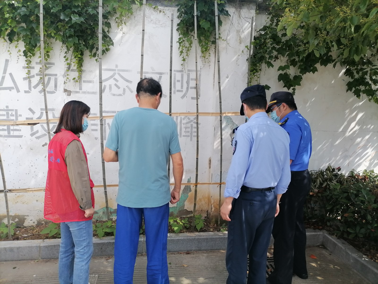 网格员一边将照片上报至社区工作群,一边上报到了街道网格事件“最多报一次”微信群。社区和街道指挥中心兵分两路,社区工作人员到周边居民家入户查找肇事者,街道指挥中心将此案件分派给综合行政执法中队,不到半个小时,社区就查找到了事主——社区老年居民王某。经了解,王某种菜时绿化带内并无绿化,他便想着利用这块空地,种上了四季豆,并搭好了毛竹架。执法人员依据《浙江省城市绿化管理办法》和《宁波市住宅小区物业管理条例》对其在小区内擅自占用绿地,损毁树木、绿化设施用以种菜的不文明行为进行了严肃批评,鉴于王某认错态度较好,并且未造成相关损失,责令其于当天将种植物和毛竹架进行清理,不作其他处罚,王某表示认同。后续街道指挥中心将联系相关部门对此绿地进行绿化补种。