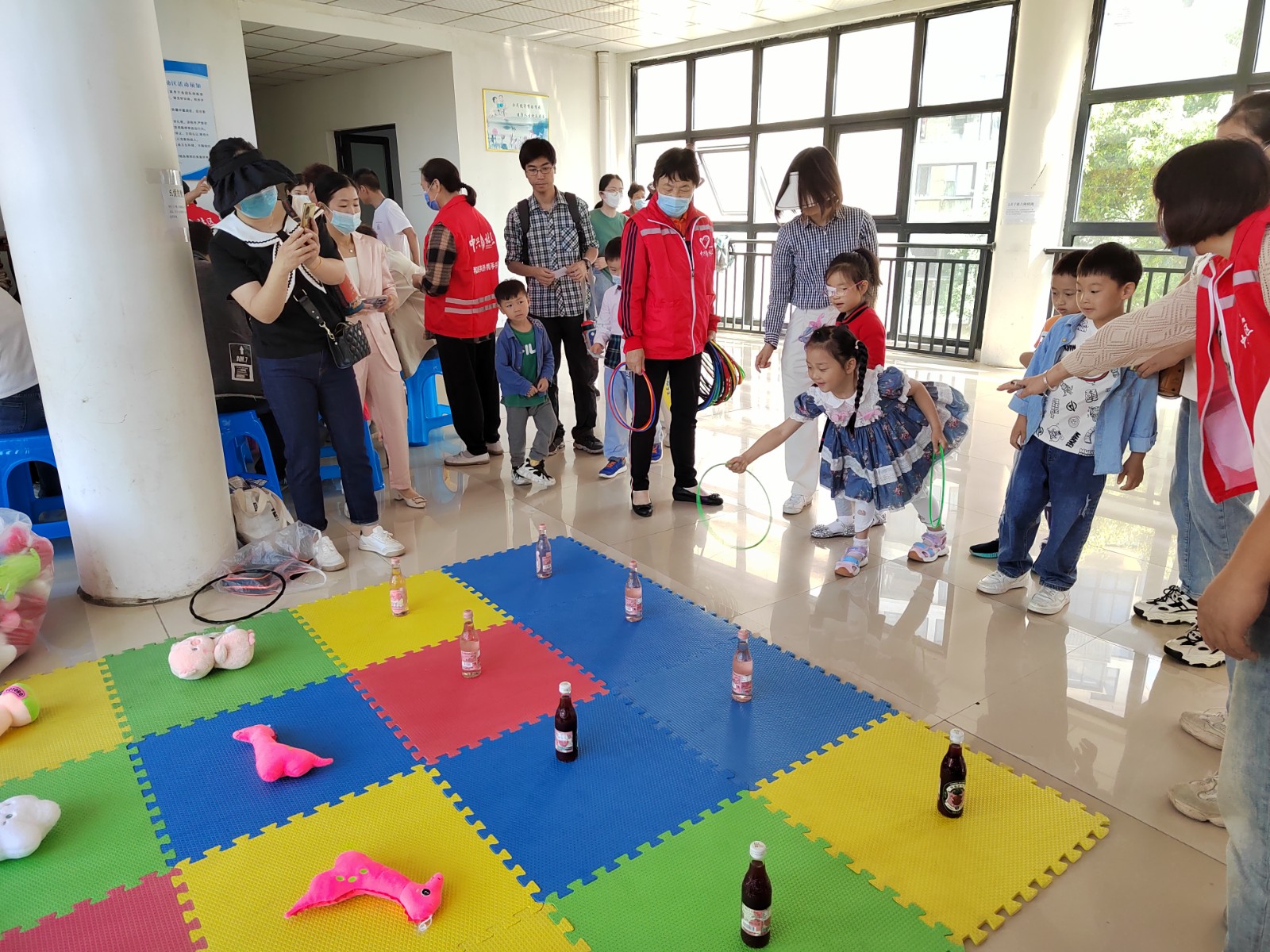活动项目包括亲子接力障碍跑、欢乐保龄球、亲子水上漂、心随椅动、爱的魔力套圈圈、萝卜蹲等,小朋友们积极地参与各个项目,特别是套圈现场围满了小朋友,一双双亮晶晶的大眼睛盯着摊位前的小玩具,一边欢呼地大叫着一边迫不及待的拿起套圈来,洋溢着其乐融融的氛围。