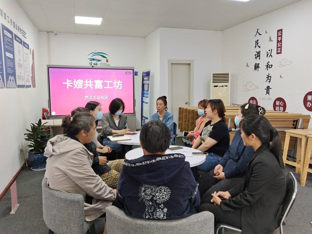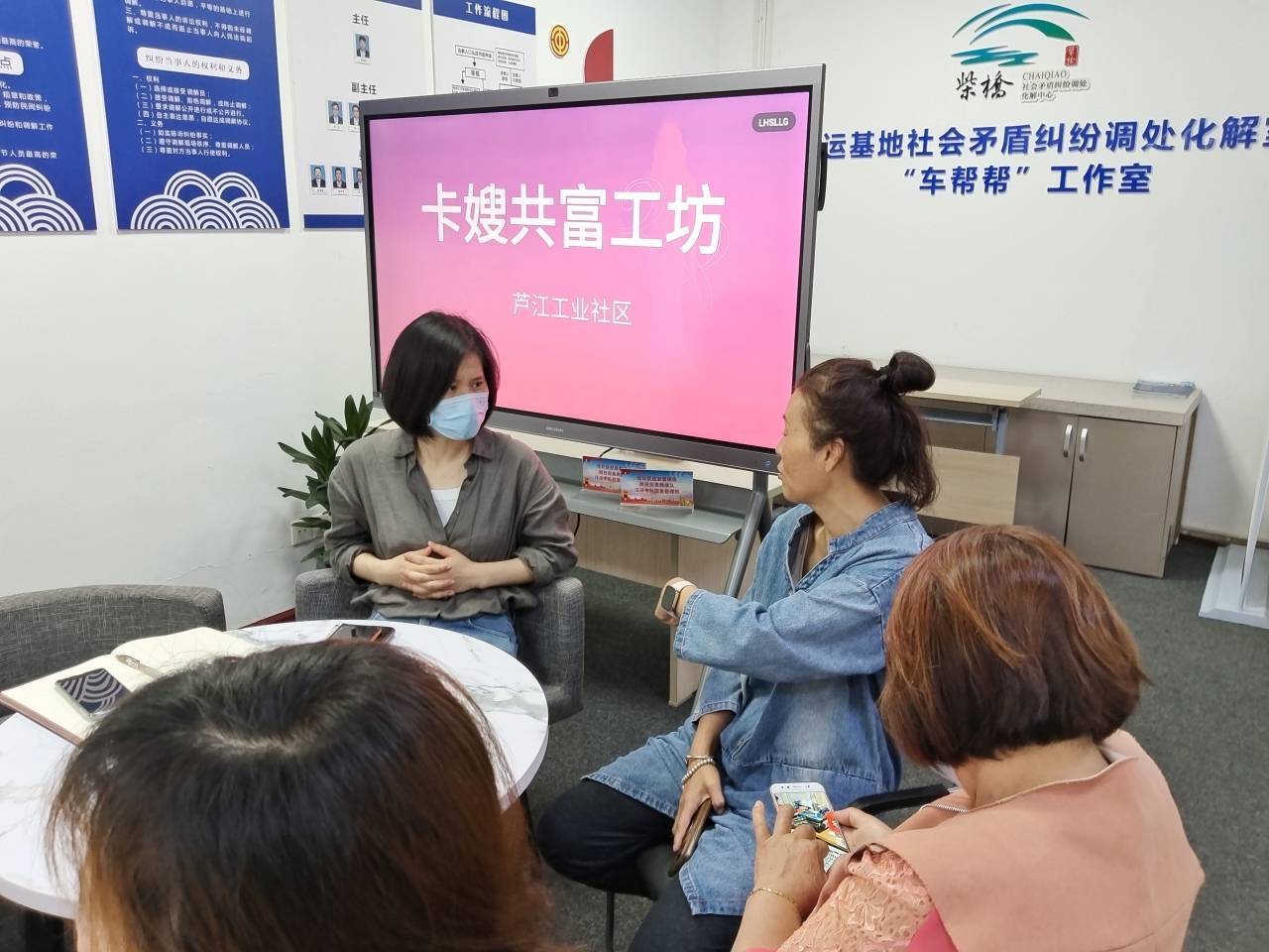 5月23日上午,在北仑集运基地的司机之家,包片社工、网格员和8名卡嫂们就“卡嫂共富工坊”开展形式、如何开展进行着热烈谈论。