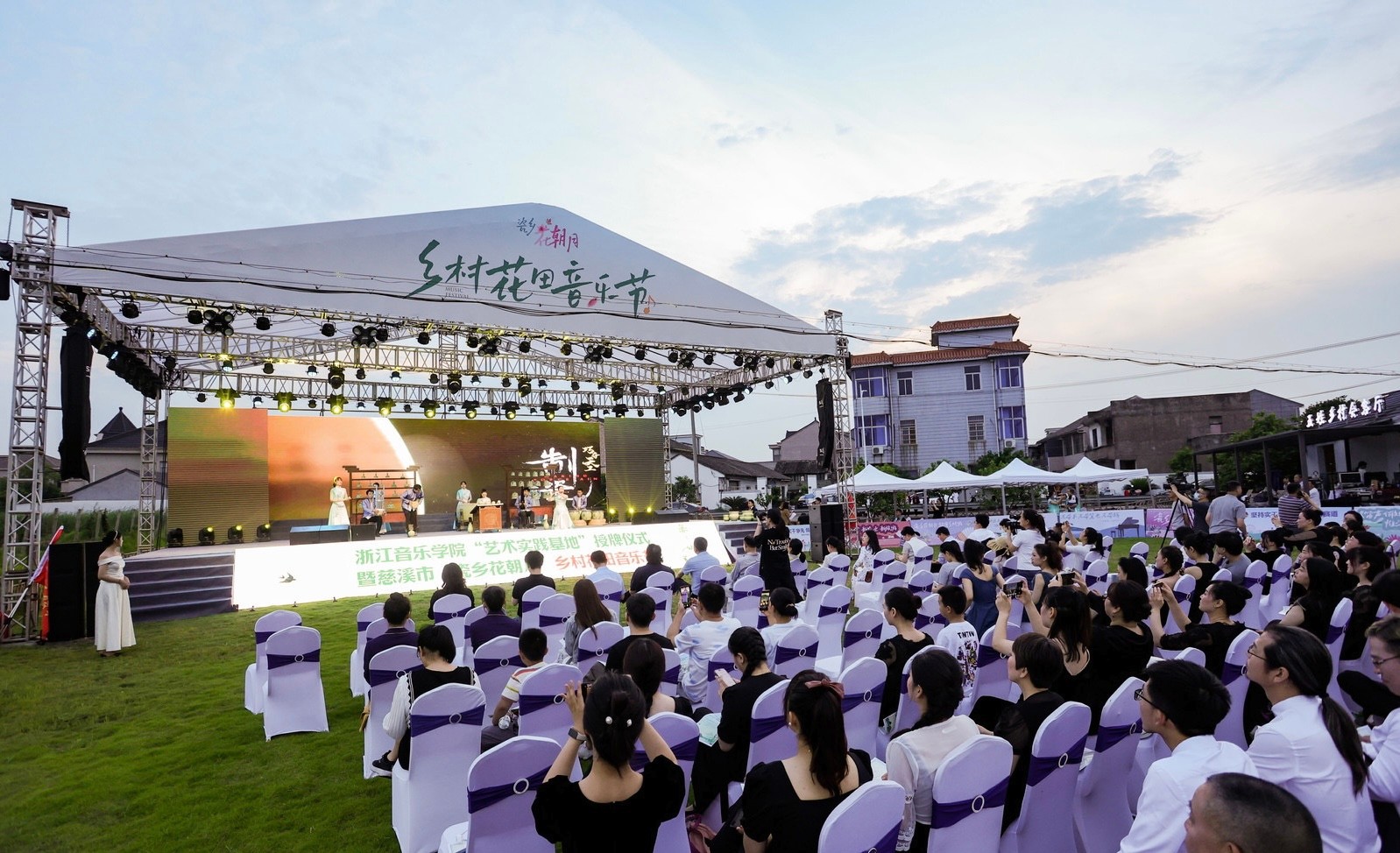 青瓷瓯乐、古筝演奏、水袖越剧;古典的、民族的、流行的……齐唱“共富曲”,共乐山水间。5月26日晚,慈溪市桥头镇五姓村农村文化礼堂旁大草坪,阵阵音浪席卷稻花,声声乐曲惊艳了上林湖畔。当晚,浙江音乐学院 “艺术实践基地”授牌仪式暨慈溪市“瓷乡花朝月”乡村花田音乐节在这里举行。