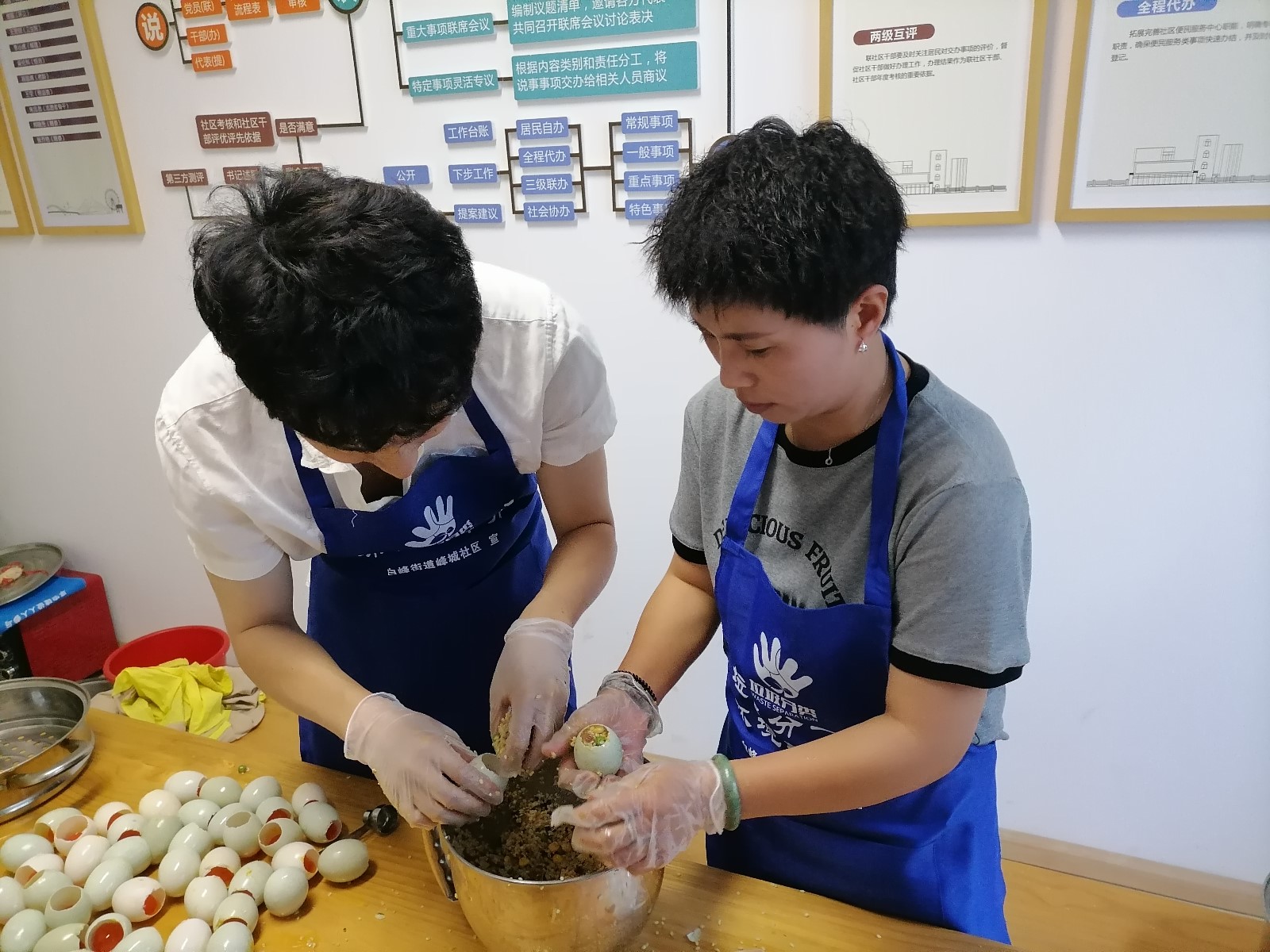 上午,峰城社区党群服务中心厨娘协会的周大姐向社区工作人员介绍了糯米蛋的制作方法,介绍完毕后大家分工合作动手制作,一组负责将事先准备好的咸鸭蛋开口,倒蛋清,而另外一组则将准备好的猪肉、玉米、胡萝卜、青豆等食材通过“洗、切、拌”制作成馅,并一点一点将拌好的糯米装进鸭蛋中,再包上锡纸,一个个圆滚滚的糯米蛋就制作完成了。