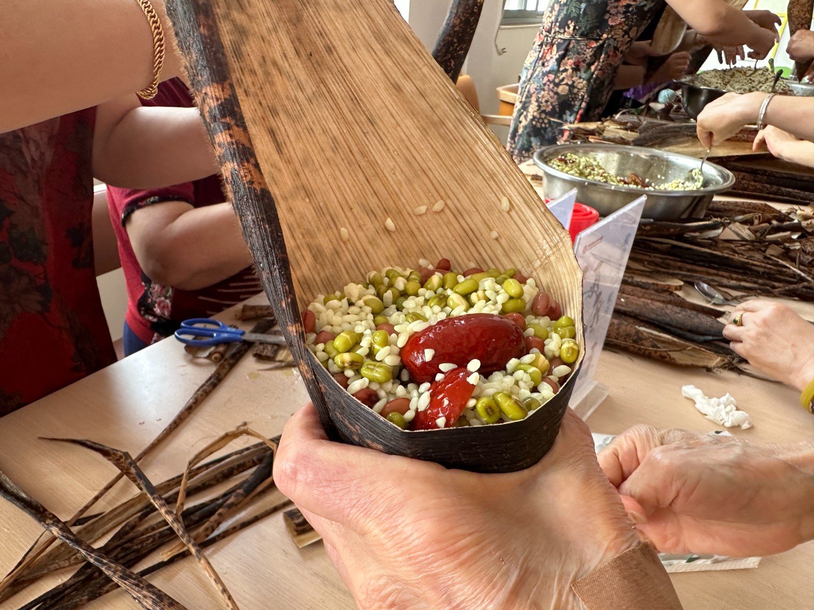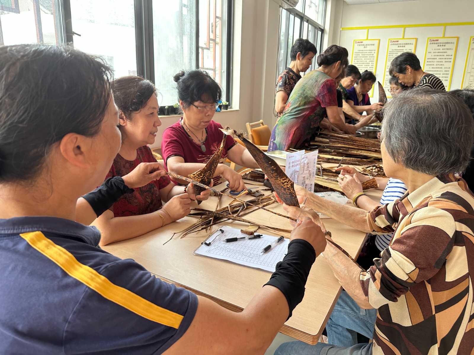 活动开始前,社区工作人员提前准备好包粽子所需材料,报名参加的居民们早早等在活动现场,活动开始技术娴熟的居民分工有序,填米、裹粽、绑线一气呵成,在居民们的巧手下精美的粽子不一会功夫诞生了。