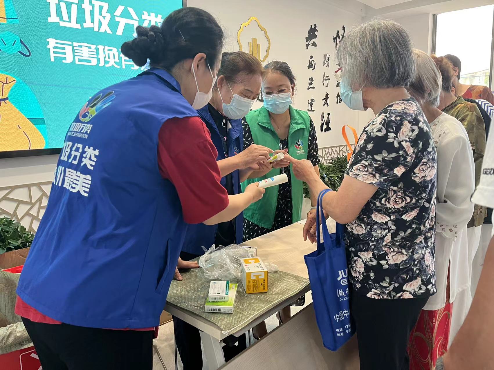 6月21日上午,石化三建社区开展有害换有爱活动。一早,居民们纷纷将家中的废电池、过期药品、过期化妆品、废墨盒等带到活动现场,“有害换有爱”活动的形式向居民解说垃圾分类的意义,提高大家自觉参与垃圾分类的意识,在日常生活中养成垃圾分类的好习惯,积极参与文明实践,争做时代新人。