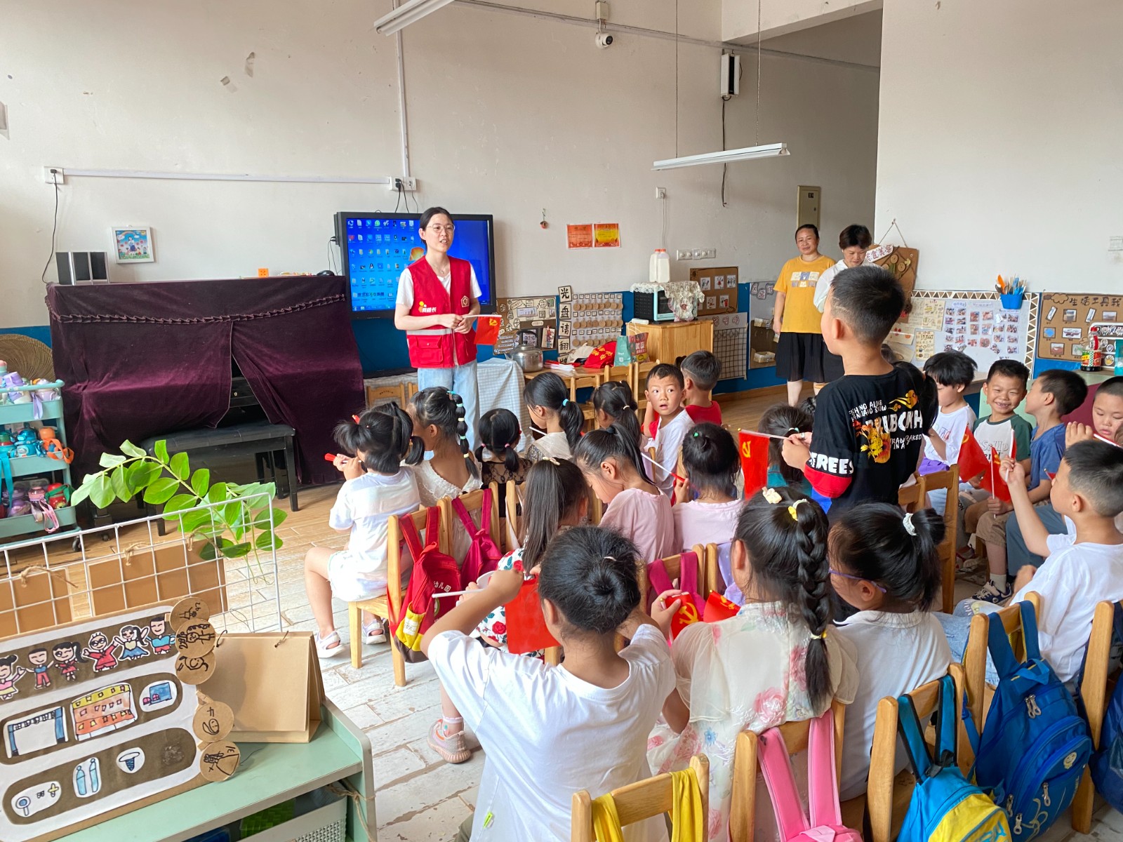迎周村网格员组织幼儿了解党史、传唱红歌,回味红色经典,传承革命精神。活动中,通过网格员的讲解介绍,让小朋友们了解党史,党徽,党旗的由来,并播放《小英雄王二小》的故事激发孩子们的爱国情怀。