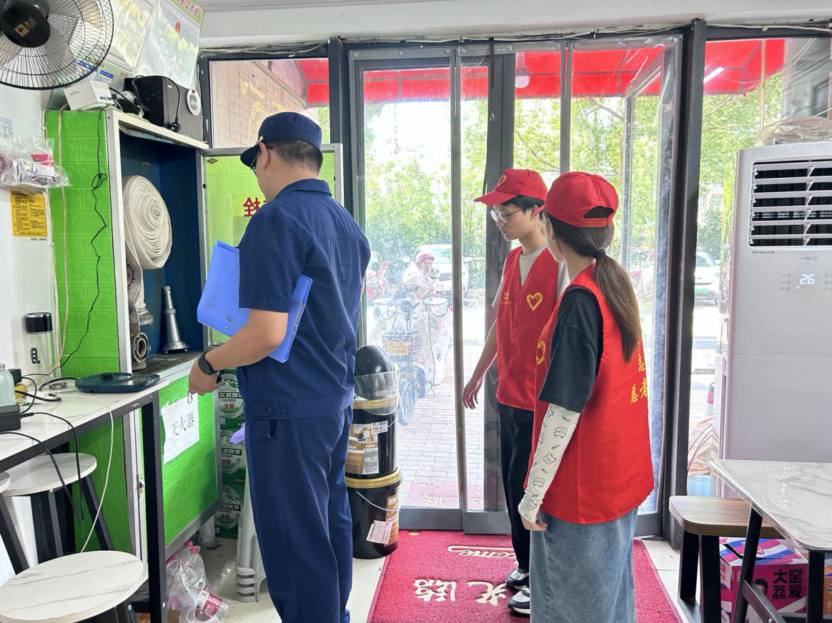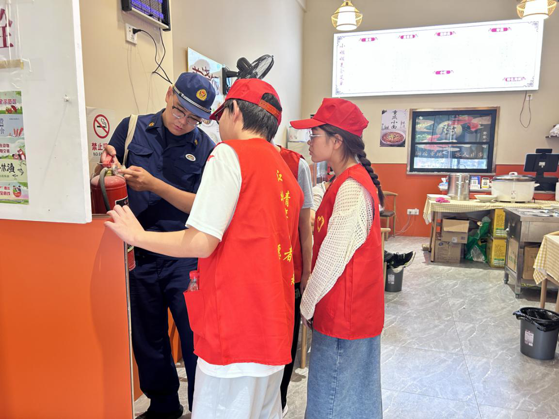 您好,我们是消防志愿者,进来查一下消防安全”“这个灭火器已经过期了,请您及时更换”“夏季炎热,请您一定要注意用火用电安全!”……在前江街道消防站工作人员的带领下,这三名大学生志愿者对前江街道辖区内的沿街商铺、居民小区等场所开展了地毯式排摸,仔细检查了店铺内的消防设施是否完好,疏散通道是否畅通等,同时提醒广大商铺天气炎热,要注意用火用电用气安全,及电动车规范停放充电等消防安全问题。