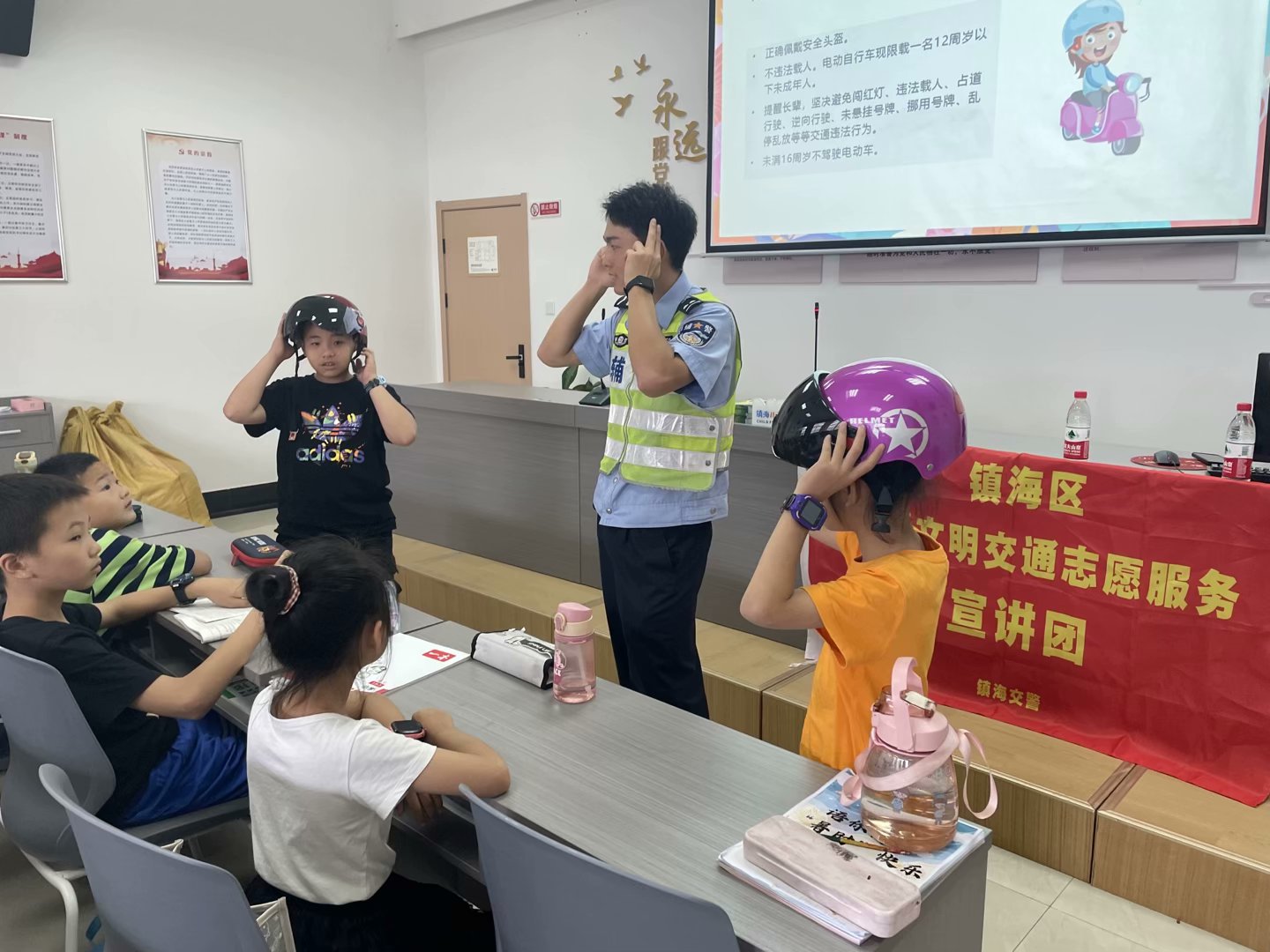 “坐过电动自行车的小朋友请举手!”宣讲团志愿者陈警官从青少年们乘坐电动自行车的场景打开了小听众们的话匣子。“一盔一带”、“宁等三分,不抢一秒”……陈警官运用PPT图文并茂地向小听众们讲解了交通信号灯、乘坐电动自行车、使用平衡车滑板车的安全知识,提醒青少年步行、骑车上下学要遵守交通规则,拒绝乘坐有安全隐患的加装改装车辆,提高监护人责任意识,对自己和他人的生命安全负责,加深了青少年对交通安全的理解。除此之外,陈警官还教授了大家佩戴头盔的方法,切实提高自身交通安全意识和自我防范意识。