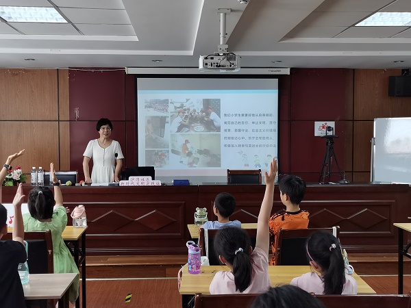 “为了举办这次亚运会,杭州市发生了翻天覆地的改变,地铁线路更加便捷,公共交通系统更加环保、低碳,城市风貌进一步提升......”讲座中,郑老师先为孩子们讲解了亚运会在中国的举办历史,随后介绍了本次亚运会的主题、吉祥物以及比赛项目等,重点强调了杭州亚运会“心心相融,@未来”的口号意义以及杭州为迎接亚运所做出的努力,呼吁孩子们要更好地从自身做起,规范自己的言行,举止文明,遵守规矩,爱国守法,将社会主义价值观时刻铭记心中,乐于去帮助他人,积极加入到参与亚运会的行动中去。