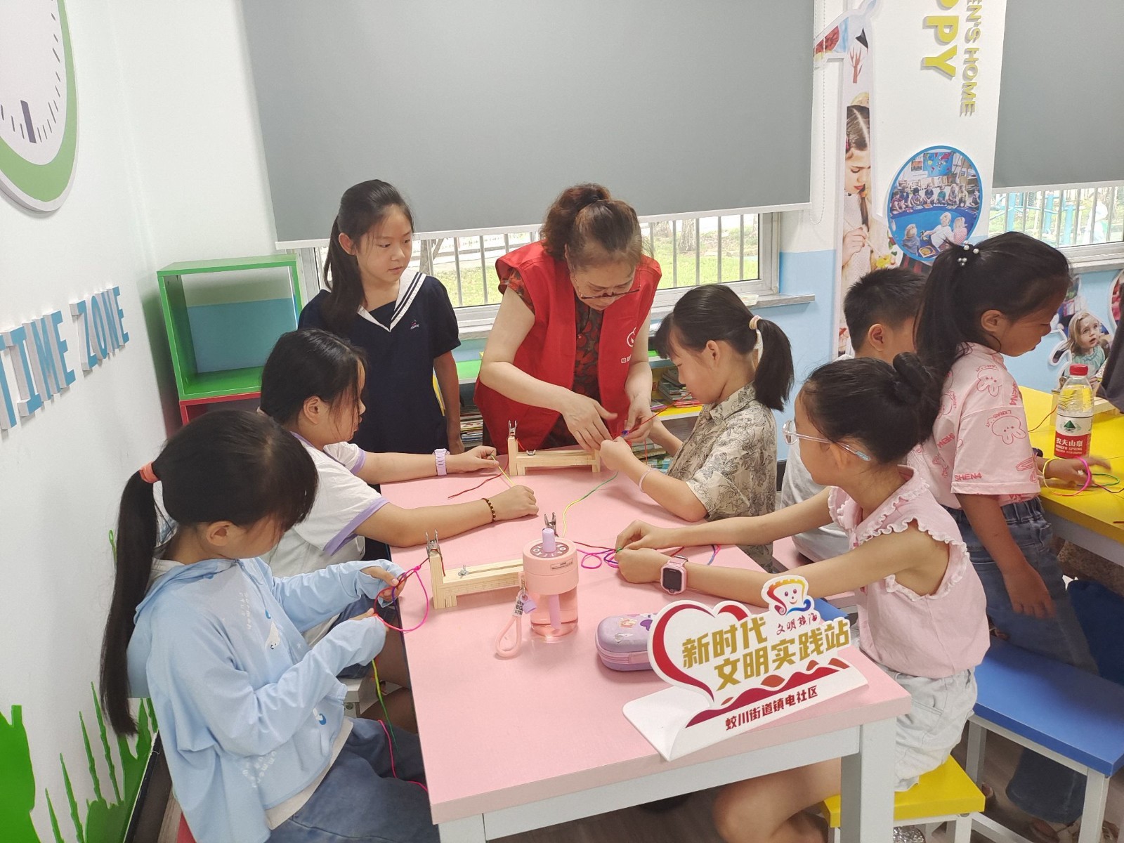 为丰富青少年儿童暑期生活,锻炼学生从小动手动脑能力,让同学们在学习的间隙适当放松,镇海区蛟川街道镇电社区新时代文明实践站联合镇电社区暑期假日学校开展彩色手链编织活动在镇电社区“别样红”阿姨手工坊志愿者们和网格员的带领下,同学们积极动手进行编织活动。