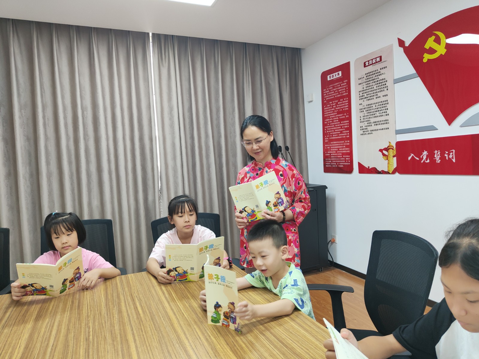弟子规,圣人训。首孝悌,次谨信。泛爱众,而亲仁。有余力,则学文。清晨,孩子们清澈响亮的朗诵声从活动室中传了出来。原来是江北区教育局的江老师在带领着孩子们诵读《弟子规》