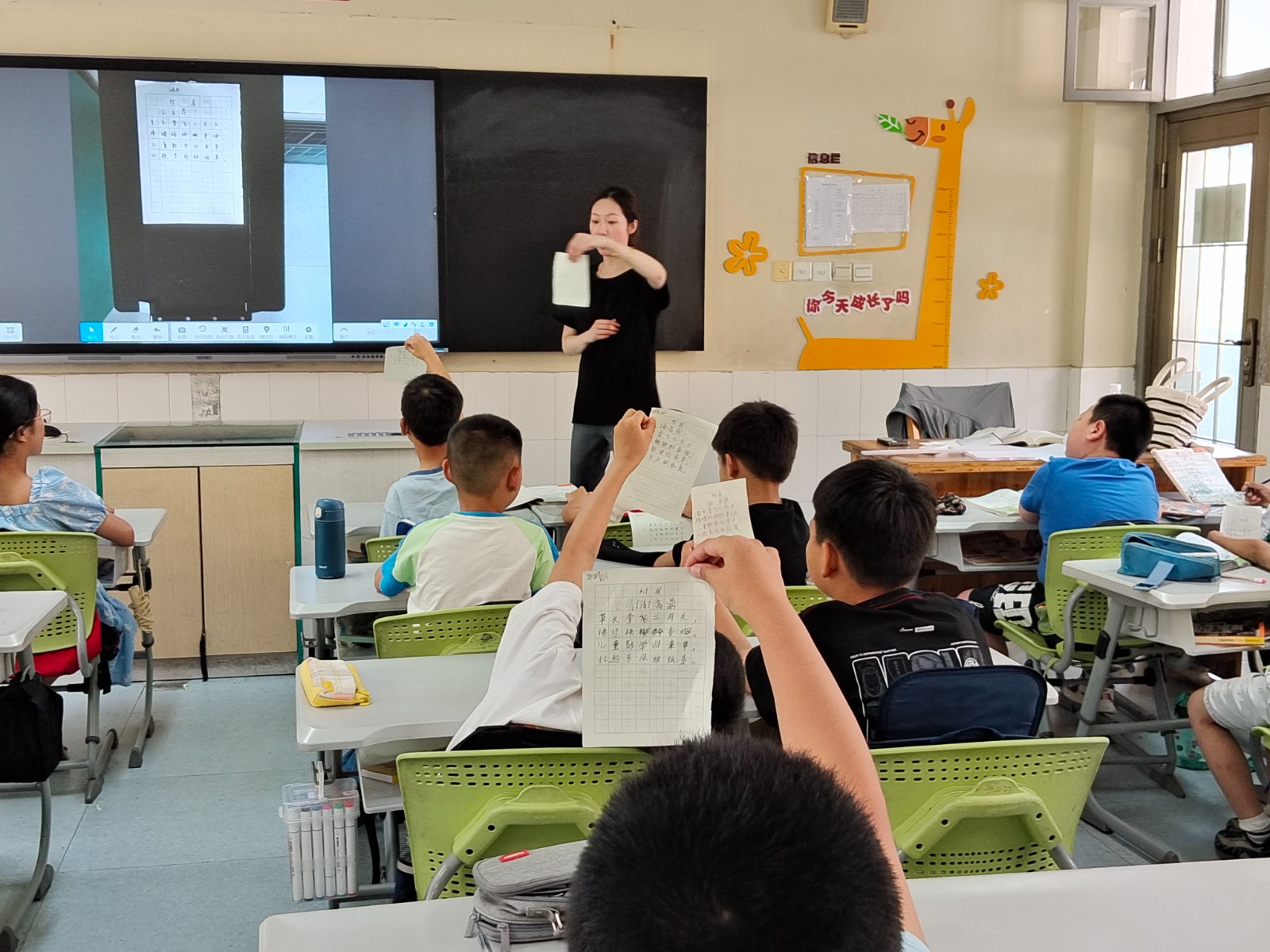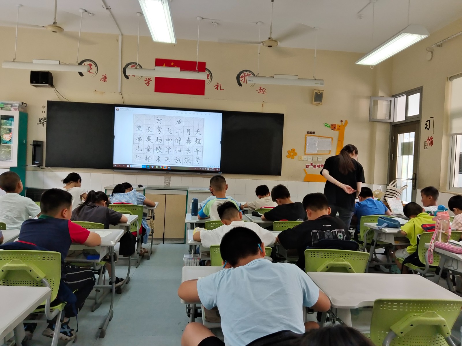 “同学们坐姿端正,握笔标准,竖画要写垂直,下笔稍重,行笔垂直向下较轻,收笔稍重......”。小朋友按照老师指导的一撇一,一个个端正清秀的楷体文字跃然纸上。俗话说到字如其人,一幅幅书法作品也正表现出了小朋友们纯真灿烂的心灵。老师教学生们一首《村居》,字体端正、整洁、清秀,每个学生安静地坐在自己的位置上继续练习书法,实为难能可贵!老师结合名家字帖进行分析、帮助学生理解,并从字的基本笔画到起笔、运笔、收笔、行款、布局等以及书法作品的形式都作了很好的演示。老师专业的讲授,形象生动的例子,让在座的学生兴趣盎然,如醉如痴,纷纷执笔练写,同学们都感受到书法的神奇魅力。