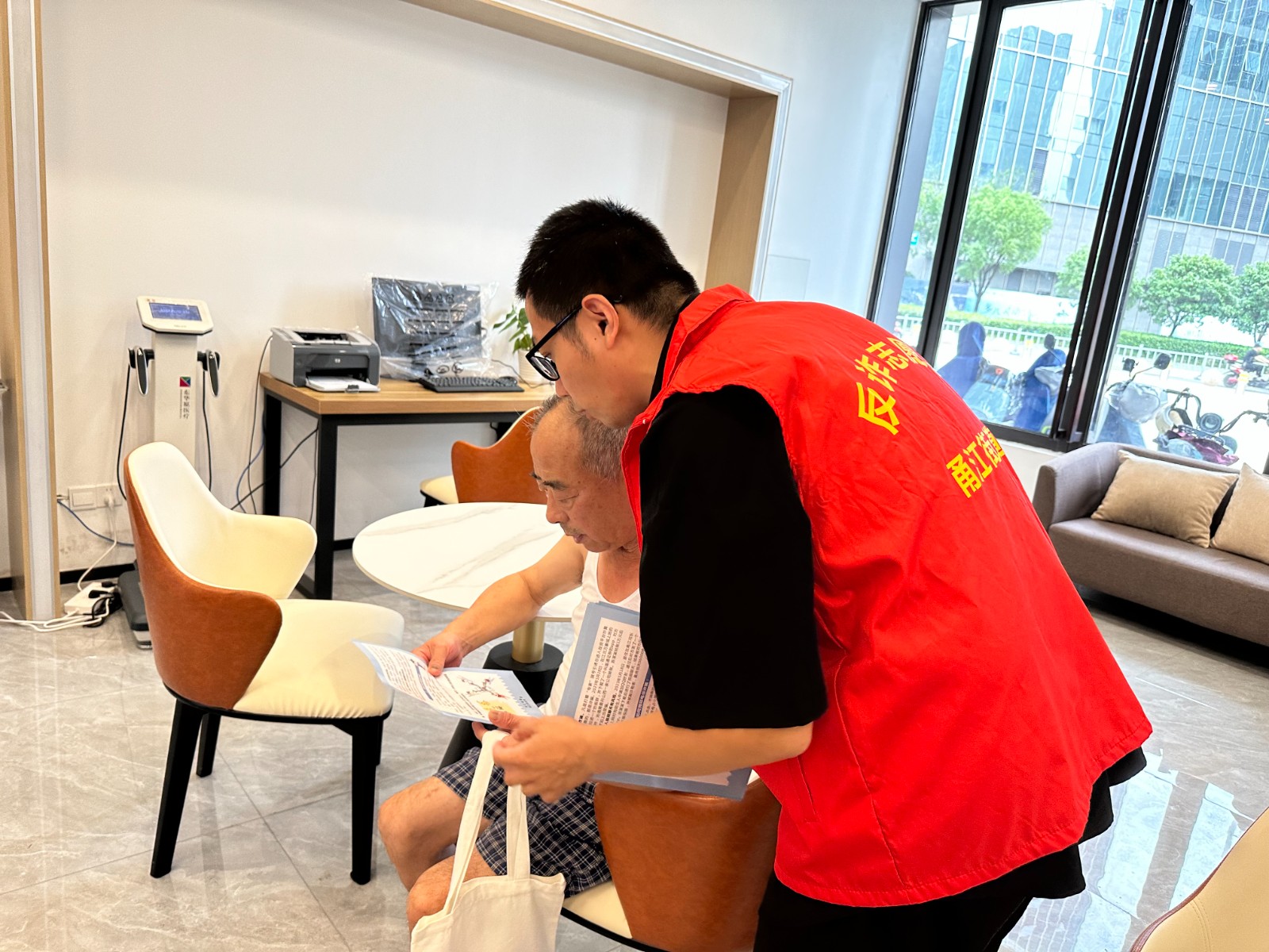 活动现场,志愿者在社区居家养老服务中心设立了眼底筛查、测血糖、量血压等不同类别的服务项目,同时姚江社区卫生服务中心的医生为老年人开展免费全科义诊,为老年居民提供健康咨询,给居民提供健康管理指导。前来参与就诊的人们络绎不绝,现场工作人员认真询问老人的身体状况,还不忘和老人唠唠家常。