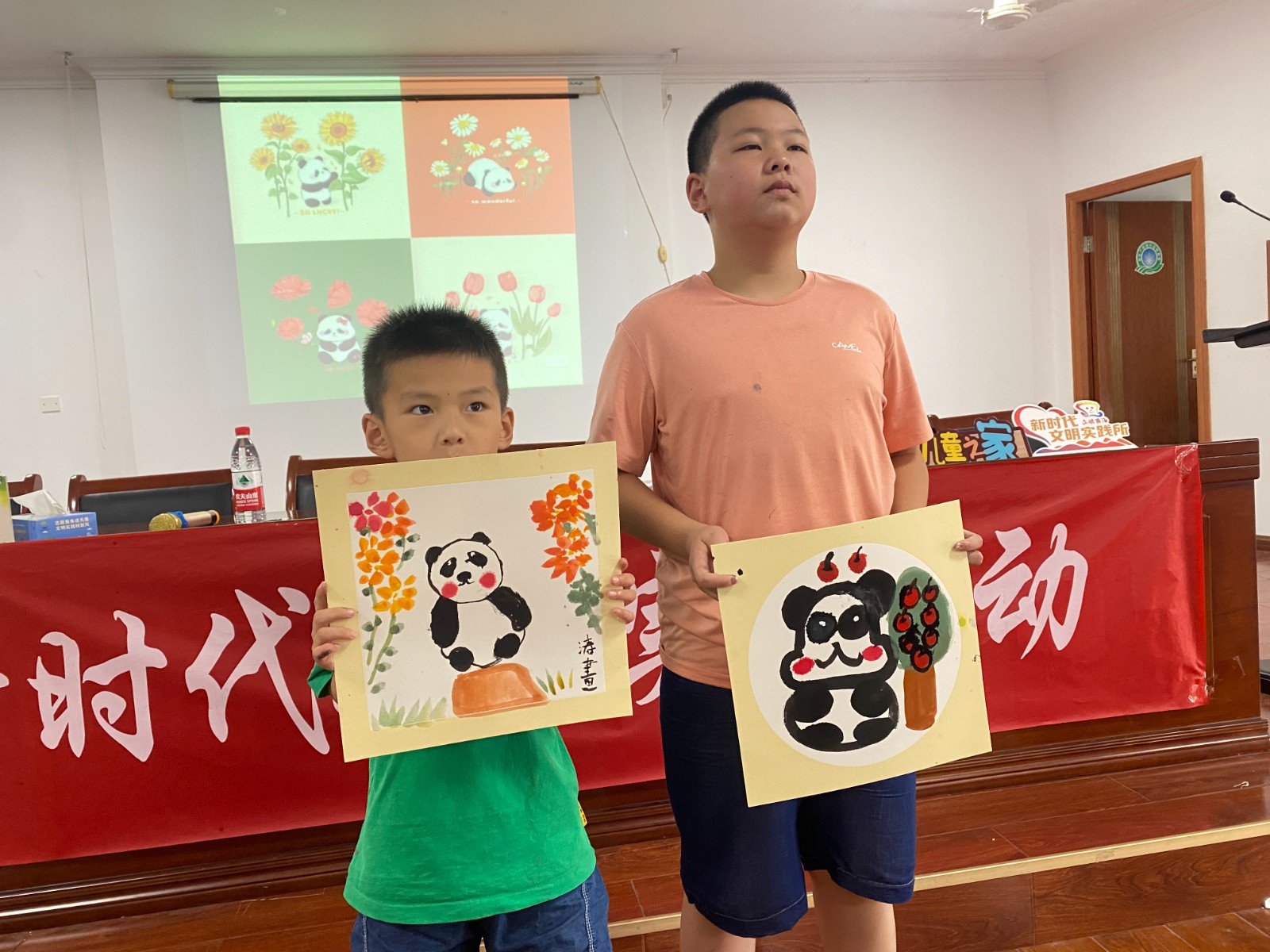 活动中,迎周村社工邀请到国画老师到迎周村为孩子们进行国画指导,本次课程的绘画主题是竹子与熊猫。在赵老师的带领下,孩子们时而手拿画笔,时而认真思考,专心致志的样子宛如小画家。大部分孩子都是第一次接触国画,老师手把手地教,小朋友们认真地听。经过两个小时的时间,孩子们纷纷完成了自己的作品,举起自己的画作,高兴地向老师展示。