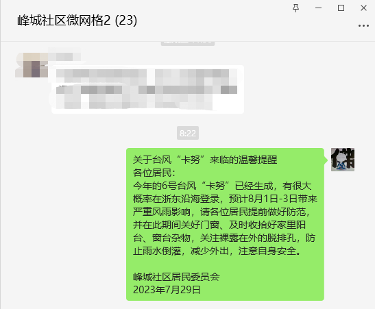 及时预警,守护群众安全。“各位居民:今年的6号台风“卡努”已经生成,有很大概率在浙东沿海登录,预计8月1日-3日带来严重风雨影响......”峰城社区党群服务中心严格落实值班制度,全员严阵以待,对台风进行实时监控,时刻关注降雨区域及雨量变化,确保第一时间发现问题,第一时间妥善处置,牢牢掌握防汛防风主动权,利用九个微网格群,发布预警通知,进行温馨提醒,告知居民在台风影响期间关好门窗、及时收拾好家里阳台、窗台杂物,关注裸露在外的脱排孔,防止雨水倒灌,减少外出,注意自身安全,有效提高居民防范意识。同时做好高龄、独居老人走访安抚工作,进行妥善安置。切实为保障居民群众的生命安全筑起“红色屏障”。
