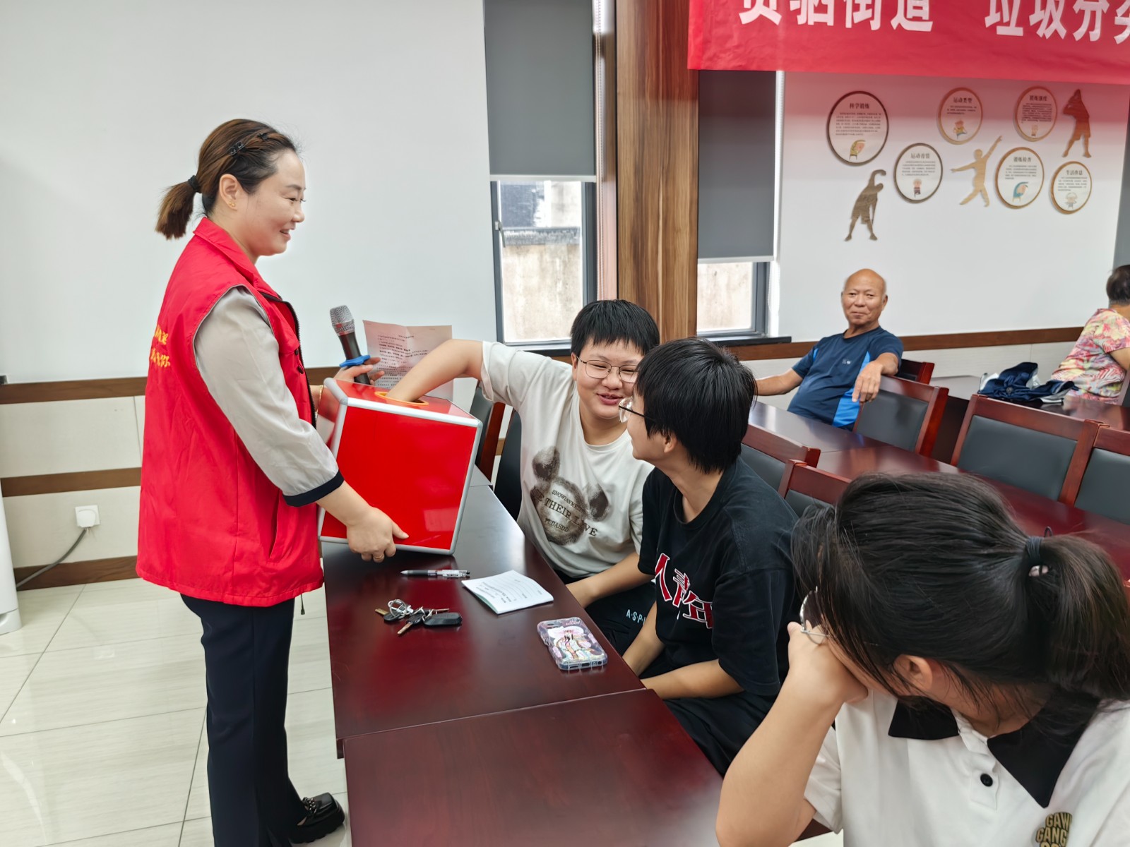 活动现场,社区工作人员通过分类转盘游戏、抽奖问答等方式,调动起居民的积极性。“我们平时用过的卫生纸属于什么垃圾?”“我知道,属于其他垃圾!”“纽扣电池呢?请这位阿姨回答。”“这个我知道的,属于有害垃圾!”······不管老的少的,都积极举手发言,垃圾分类达人还分享了自己的生活小心得,现场气氛积极而又热烈。游戏环节结束后,社区工作人员分发了宣传折页,播放了环保电影,让居民们对垃圾分类有了更深入的了解。