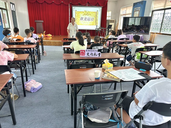 原来,在陈华浦文化礼堂,正为假日学校的孩子们播放着陈华浦社区独具特色的舞龙民俗表演视频,让青少年“零距离”接触传统文化,孩子们对此也充满了好奇与惊喜。