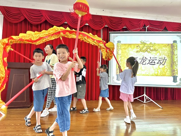 “小朋友们,你们可以来试试看,一起感受一下。”非遗传承人戴源鑫向孩子们发出了邀请。“我来,我来,让我试一下吧。”“我也想试试!”……小朋友们都把手举得高高的。在戴老的指导下,小朋友们接过了棒子,有板有眼地学起舞龙,腾云、入海、翻腾……整套动作慢慢呈现,把一条龙给“舞活了”。孩子们在参与的过程中感受到丰富的文化内涵和乐趣。