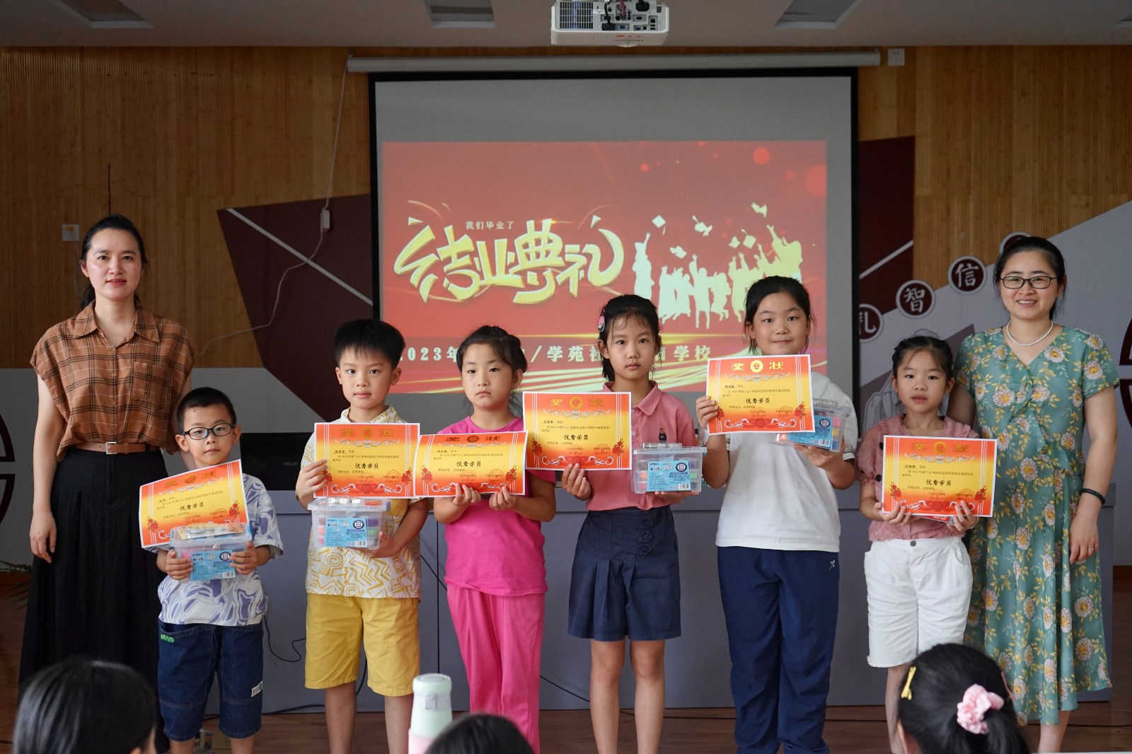在毕业典礼最后,综合各位小朋友们一个月以来的课上表现,两个社区共评选出了孔珑琦6位优秀学员,并给他们颁发了荣誉证书和学习用具以资鼓励。