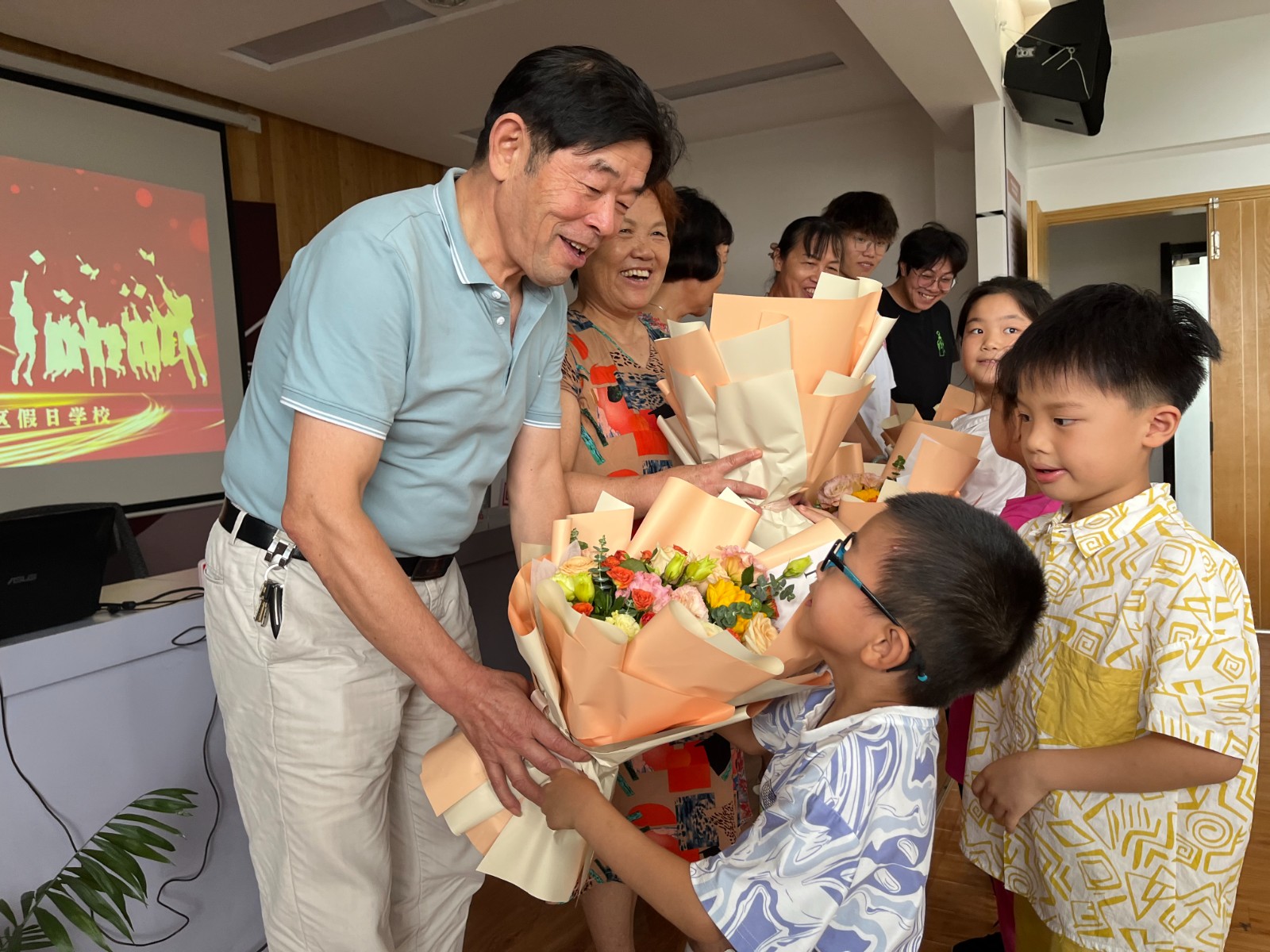 “我们度过了一段充实而精彩的时光,为孩子们的作业答疑解惑、和孩子们一起完成手工作品、护送孩子上下学,我们在服务中感受到了满足!”五老志愿邱亚凤毕业典礼上发表了感言。五老志愿者是假日学校的一抹亮彩,为假日学校工作的顺利开展起到了添砖加瓦、保驾护航的作用。随后,孩子们为五老志愿者们送上了鲜花,感谢他们的辛勤付出!