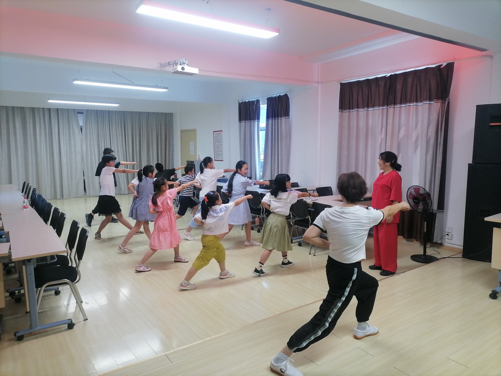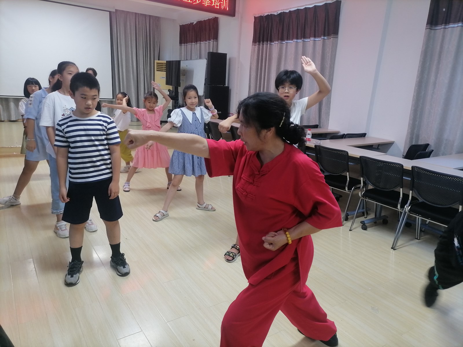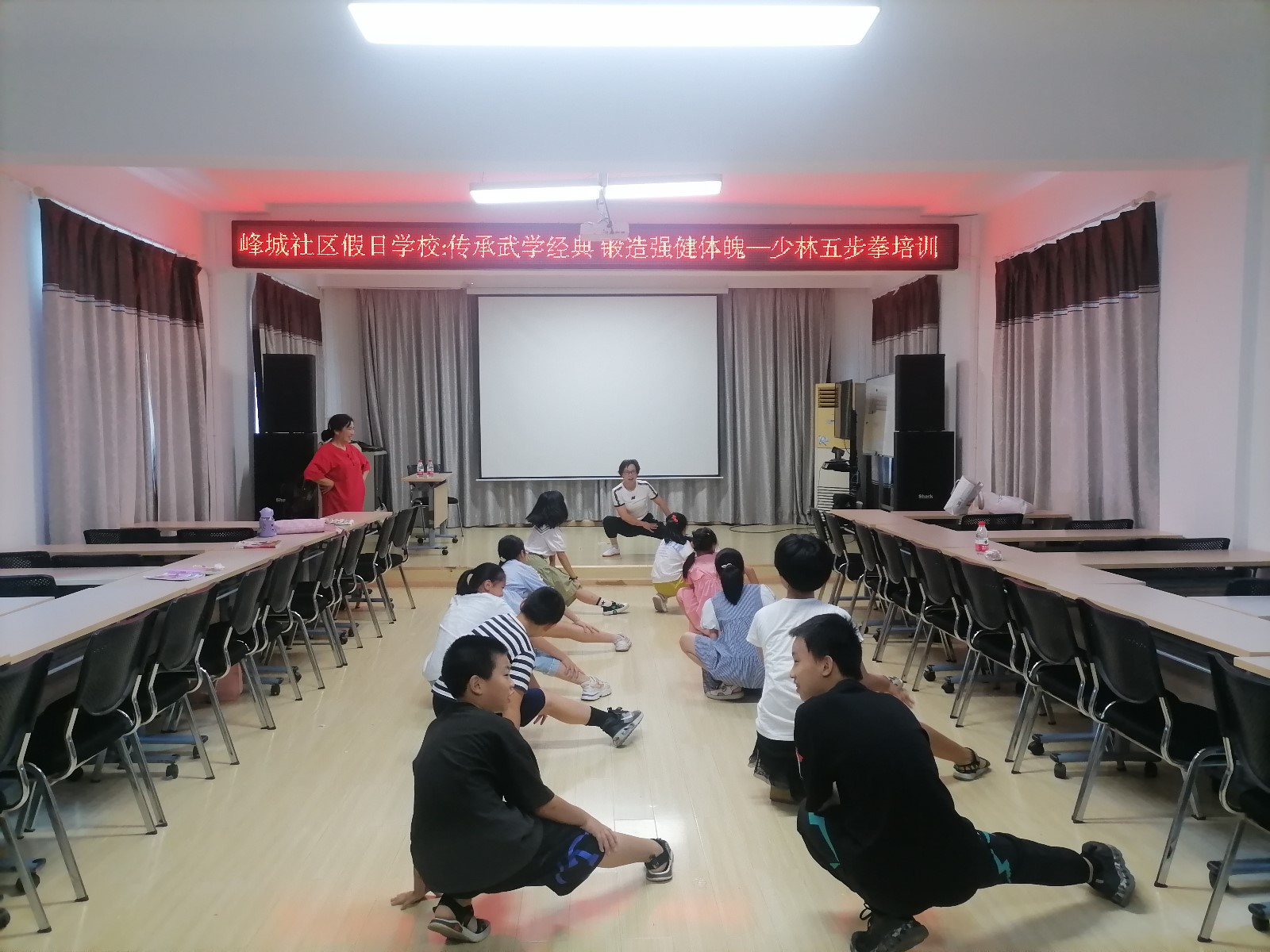 培训现场,贺老师首先向社区的孩子们介绍了少林五步拳的概念和起源,“五步拳是中国武术拳种之一,包含了武术中最基本的弓、马、仆、虚、歇五种步型和拳、掌、勾三种手型及上步、退步步法和搂手、冲拳、按掌、穿掌、挑掌、架打、盖打等手法。”贺老师通过讲解、示范和练习,让孩子们初步掌握了少林五步拳的知识和技能,并挨个进行指导,纠正小朋友们不规范的招式。小朋友们热情高涨,仔细练习每个动作,渐渐地便学得有模有样,不但动作标准整齐、出拳刚劲有力、踢腿虎虎生风,而且伴随着铿锵有力的呐喊,一招一式充分展现出了青少年的精气神。
