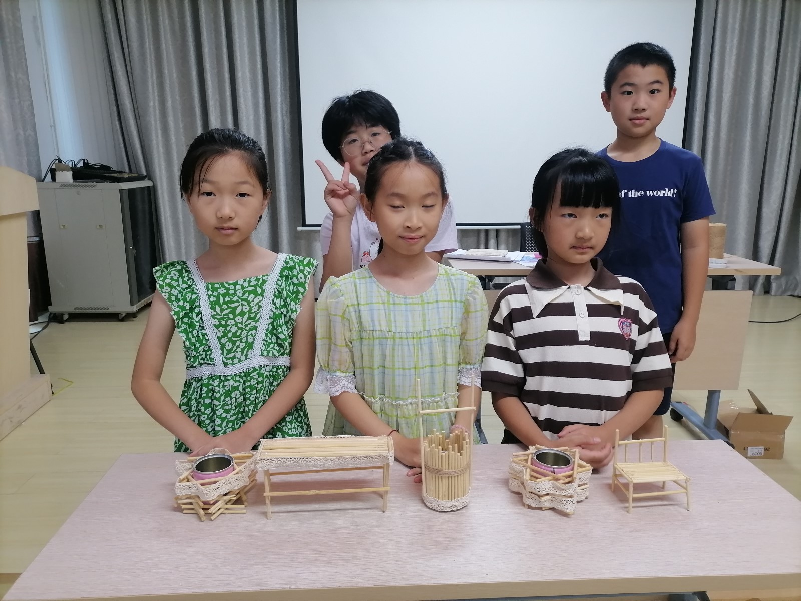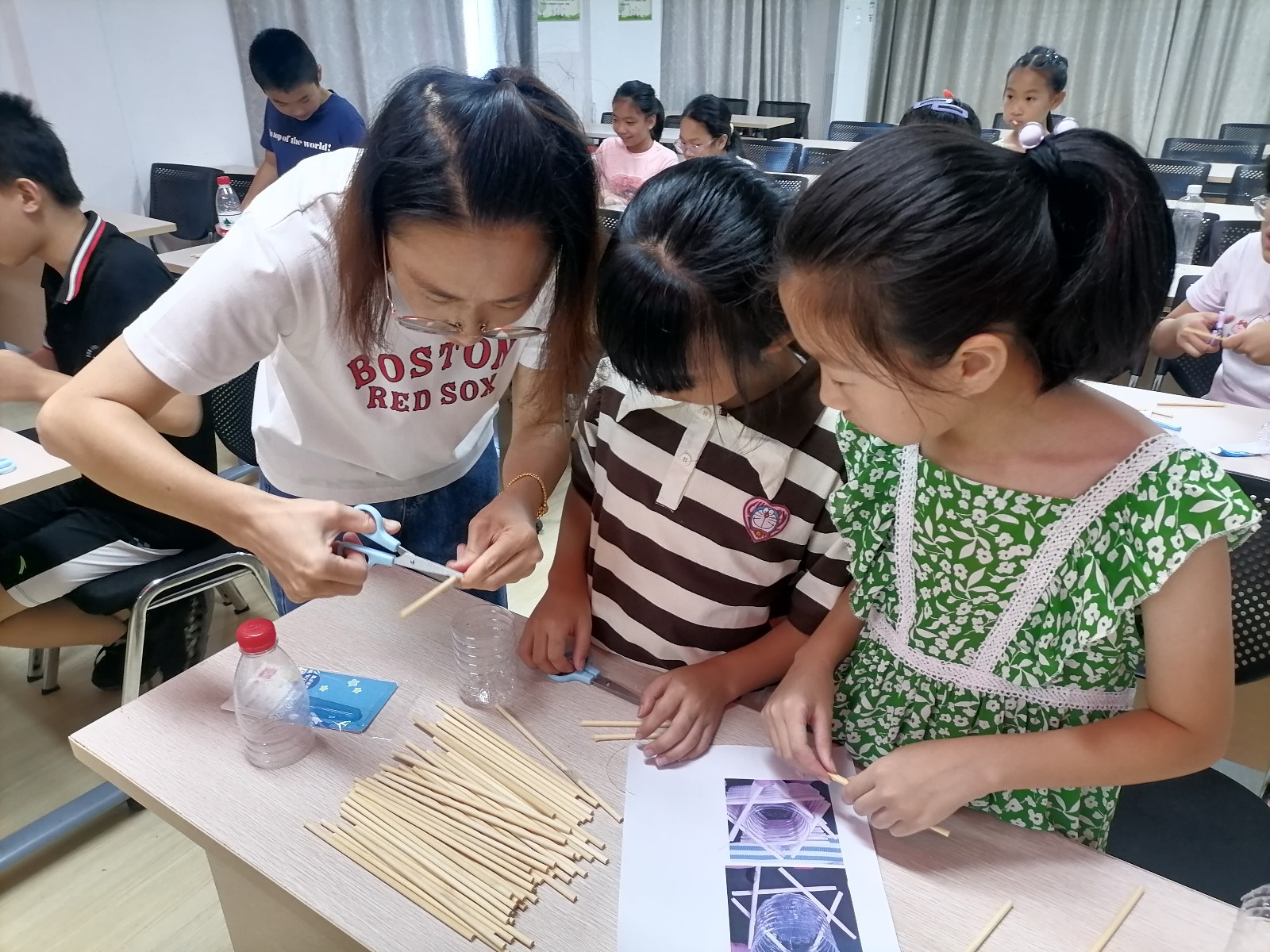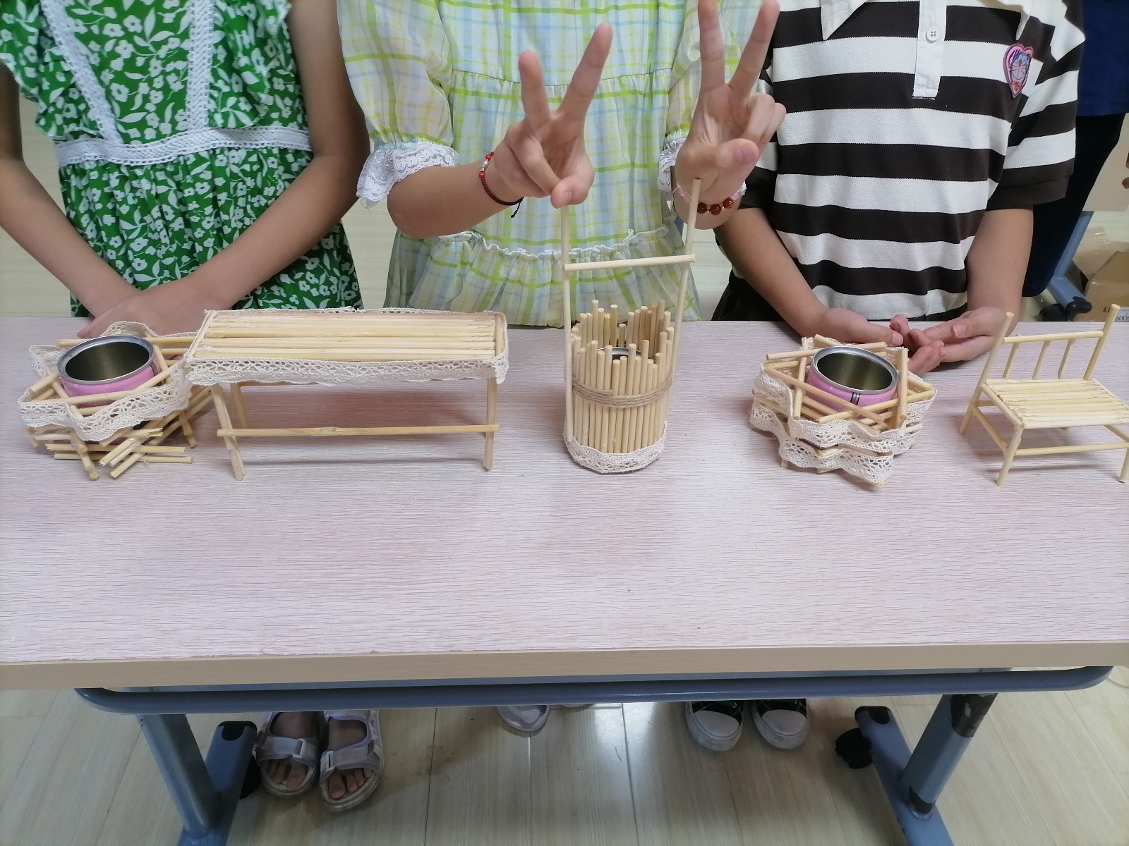 此次活动利用生活中的废旧材料,一次性筷子、矿泉水瓶等,用小剪刀将其修剪成相同长度的筷子,通过热熔胶枪进行粘贴固定后,小朋友们将一根根一次性筷子固定好。心灵手巧的孩子们各显神通,创意无限,充分发挥自己的聪明才智,有的用竹筷做成小椅子、有的做成小桌子,有的和矿泉水瓶结合制成小花篮,大家分工合作,又互相配合,将各种材料巧妙地组合在一起,制作出一件件令人赏心悦目各种小巧可爱的手工艺术作品。