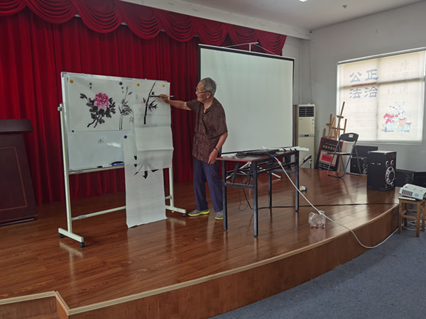 活动中,戴老先向孩子们展示并品鉴相关竹子国画作品,介绍国画文化,详细讲解了握笔、着墨、勾勒、构图等专业技巧,教授笔墨纸砚的选择、颜色的搭配等基础知识,让他们领略国画风场,体验国画的韵味。随后戴老的指导下孩子们开始学习画国画,根据戴老的教学步骤作画,先画竹竿子,竹竿子由粗到细,接着画竹叉和竹叶,在墨香中一幅幅色彩鲜明、风格多样的作品很快呈现在大家面前。