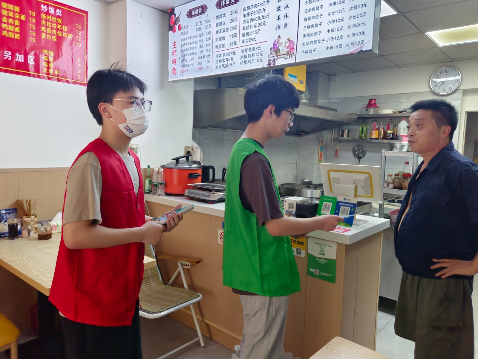 志愿者身穿四色志愿服,挨个走访商铺,进行检查和宣传垃圾分类工作。志愿者们首先向商户们分发垃圾分类宣传手册,介绍垃圾分类的重要性。通过仔细查看商铺内垃圾分类情况,对店铺分类错误的情况及时纠正,耐心解答商户提出的在分类过程中碰到的问题。“作为青墩社区的一份子,我们会从自身做起,积极参与到垃圾分类工作中,店铺垃圾都会分类好之后,定时定点投放到专门垃圾桶里,共同携手打造干净整洁的居住环境。”东北商铺老板娘表示。