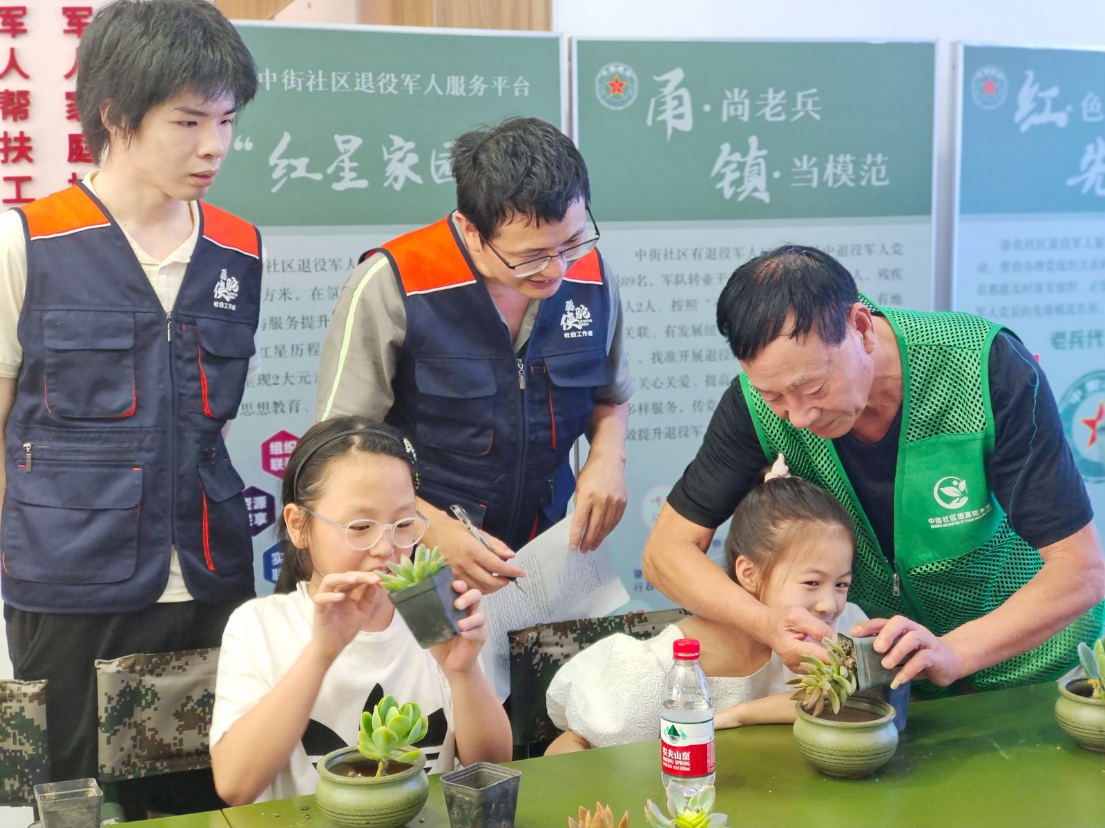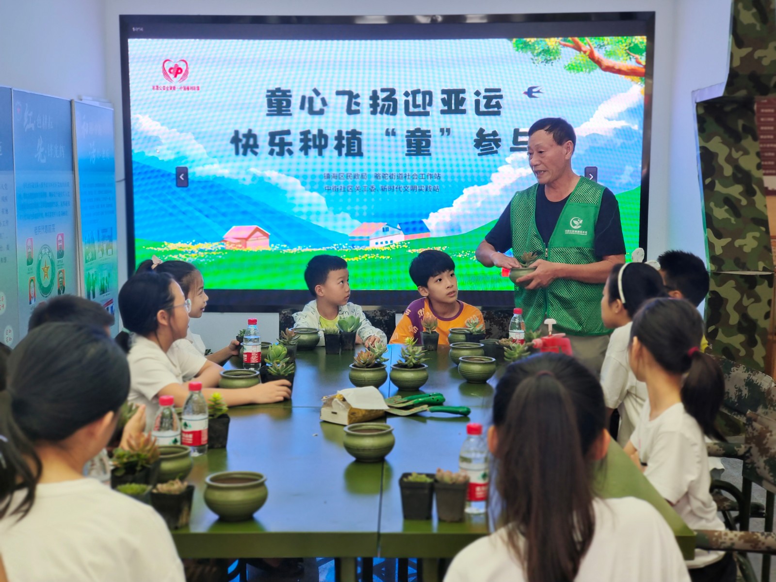 为喜迎亚运盛会,营造浓厚亚运氛围,让儿童真正地参与到社区活动中来,中街社区特邀小小“观察员”儿童观察小组成员参与童心飞扬迎亚运.快乐种植“童”参与活动。工作人员提前到场为大家准备了精美的花盆以及品种各异的多肉植物供小朋友们自由选择。中街社区绿源花木社长徐海云简单介绍了一下这些多肉植物,让小朋友们了解其命名、分类、种植特点等内容,随后带领大家边说边种。他说:“首先我们在花盆里填进营养土,泥土入盆后需要压实,不然如果一浇水,土就会松散开来。”大家按照徐师傅的指令操作,然后将多肉植物移入盆内并加以修整,一个个精致的小盆栽就完成了。通过此次活动,不仅加深了未成年人的环保意识,激发了孩子们爱绿、护绿、亲绿的感情,增强了保护环境的意识。