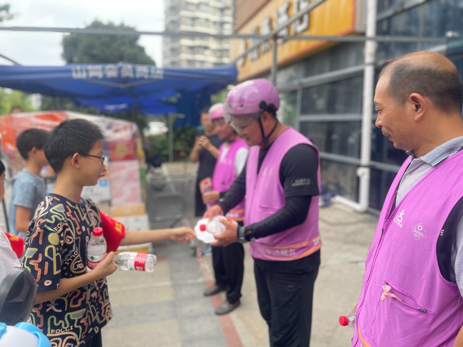 “叔叔您辛苦了,这是我用零花钱买的水和今天自己手工绘画制作的小扇子,送给您希望在这个炎热的夏天带去一丝凉意。”一个来自天合社区“红小萌”团队的小辰同学留着汗珠笑脸说道。