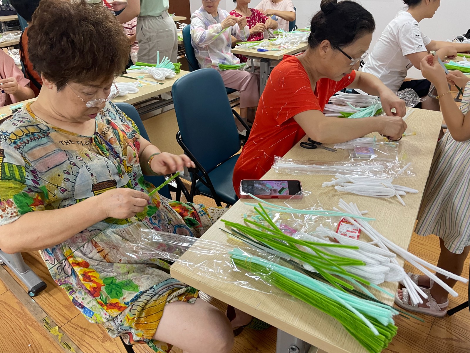 在活动现场,工作人员将材料和共工具分发给大家,通过现场示范的方式,大家认真地聆听并跟随工作人员的步骤以及教学视频,边看边听边学,让手上的扭扭棒动了起来,一扭一捏,一卷一折,一根根扭扭棒在阿姨们的手中开始变成花瓣、莲蓬和茎杆。荷花的制作看似简单却也给阿姨们带来一些“小麻烦”,例如一个人很难把这个花瓣和杆子粘在一起,但是阿姨们没有放弃,最后好看的荷花就制作完成了。
