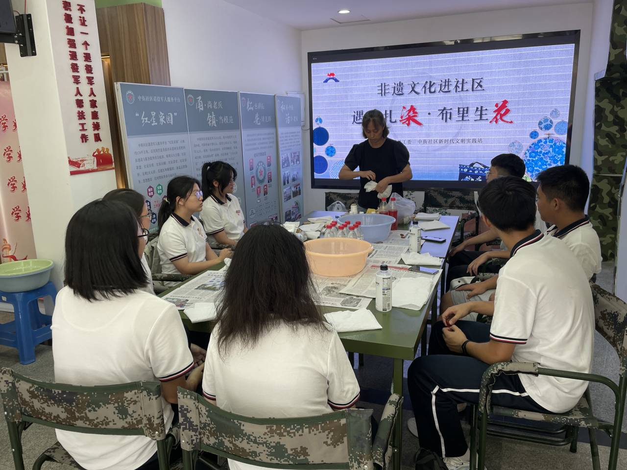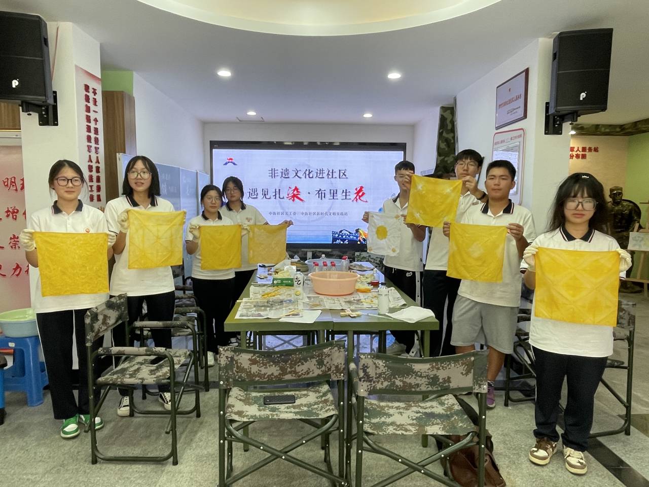 为丰富社区生活,传承非物质文化遗产,让孩子们亲身体验创意工艺背后的魅力,8月11日,中街社区新时代文明实践站联合社区关工委邀请骆驼中心学生们踏入了中街社区有点蓝布艺坊,迎来一场别开生面的非遗文化之旅。一进入课程,大家立刻被精巧的文化设计所吸引。俞老师向大家生动地讲述了扎染背后的知识。孩子们聚精会神地倾听,了解到扎染的不同技法后,纷纷投入到手作中。经过放置固色后,拆去缬结,缤纷的色彩碰撞出令人惊叹的美丽,图案花纹自然天成却又别具一格。大家兴奋地互相展示自己独一无二的作品,分享着这次奇妙的体验。