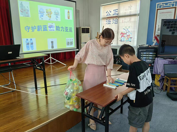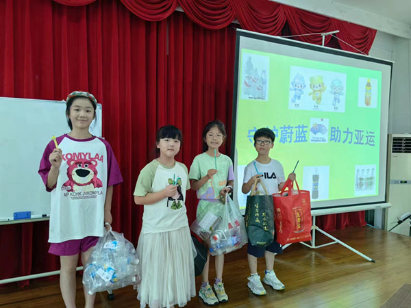 守护蔚蓝,助力绿色亚运,近日,陈华浦社区假日学校开展废弃塑料瓶兑换亚运小礼物活动。