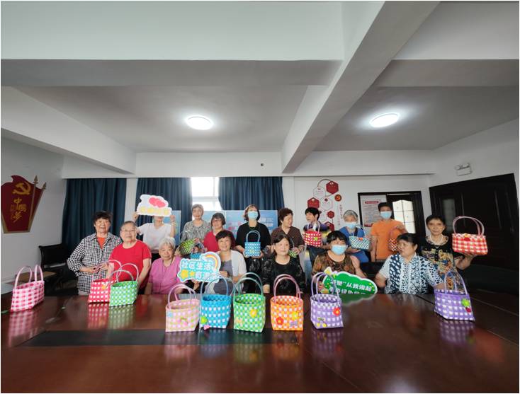 随后的手工编织过程中,每个人都选择了自己中意的各色彩带,在老师的详细指导下,一根根彩带穿梭在指尖,大家聊着笑着,美美的菜篮子一圈圈“长高”,个别跟不上的开始着急了:哇,你们咋那么快啦?快帮我看看,我怎么总是在拐弯的时候弄不好?话音刚落,还没等老师走过去,好几位热心的邻居就围上去帮忙了……编织菜篮子周身,安装提手,再到粘上小装饰,大家足足花了一个多小时,终于看到了成品,紫色的、绿色的、黄色的、彩色的,每一个都“风华绝代”。每个人都对自己的菜篮子满意至极:“以后就可以带着我的“小可爱”去买菜咯,我就是菜市场最靓的仔!”“粘上了小花花、小糖果、蝴蝶结的菜篮子,拿回家我孙女铁定喜欢!”“我终于做完了,好漂亮的,差点以为做不成了,多亏有老师们的帮忙……”活动最后,大家提着自己的菜篮子与手工老师、社区工作人员们合影留念。