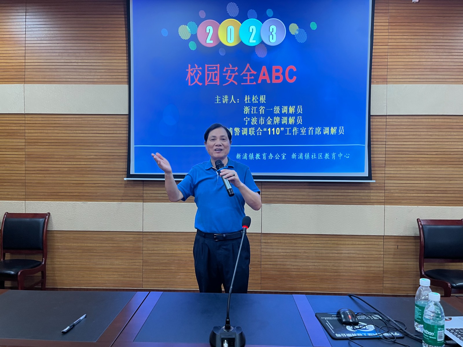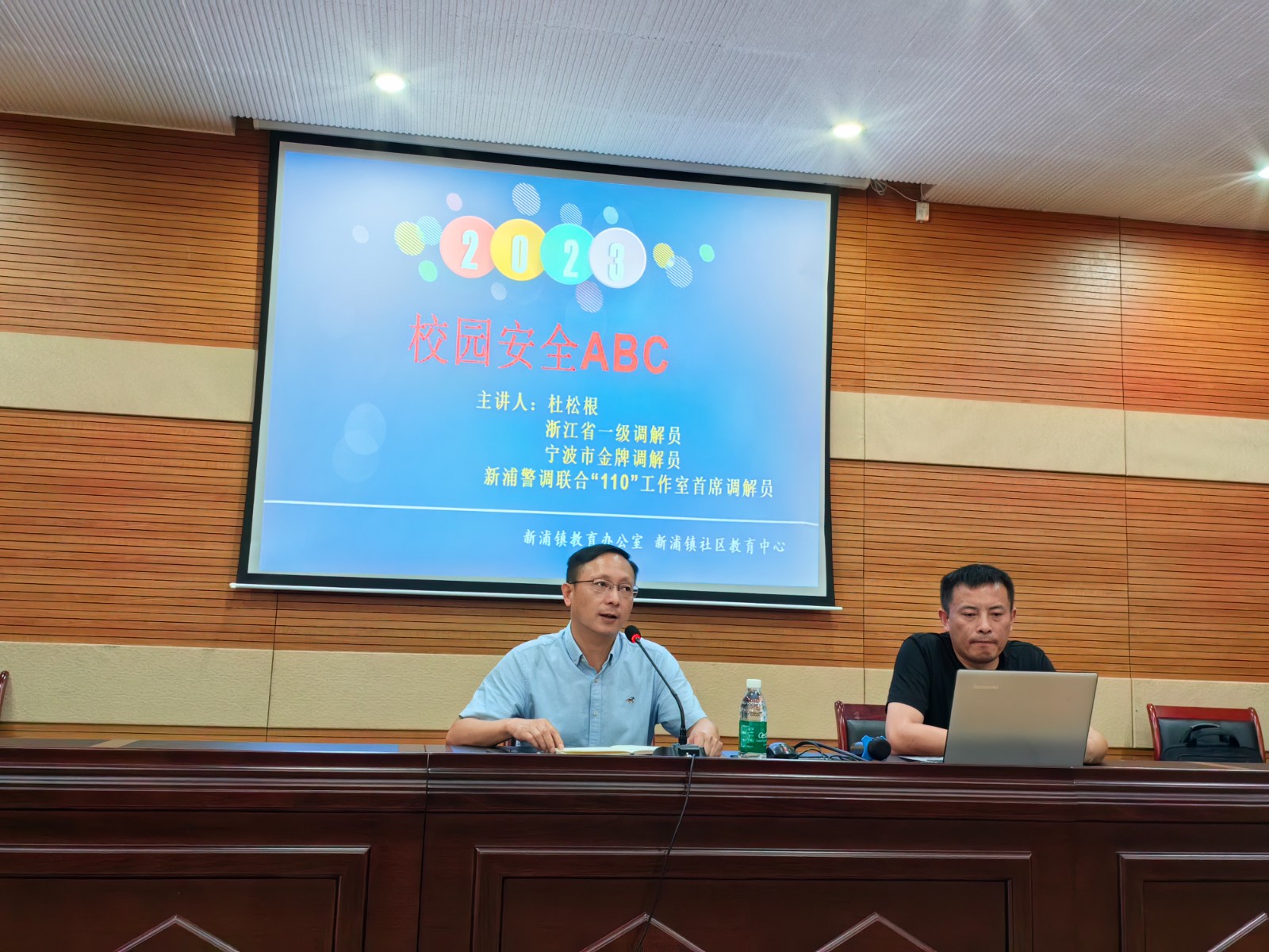为进一步加强学校安全管理,落实安全责任,8月28日下午,新浦镇教育办公室联合新浦成校开展的班主任安全培训会在新浦中学报告厅举行,浙江省一级调解员、宁波市金牌调解员杜松根老师作了题为《校园安全ABC》的专题讲座,全镇中小学、幼儿园分管校长、安全干部及全体班主任等100多位老师参加了此次培训会。