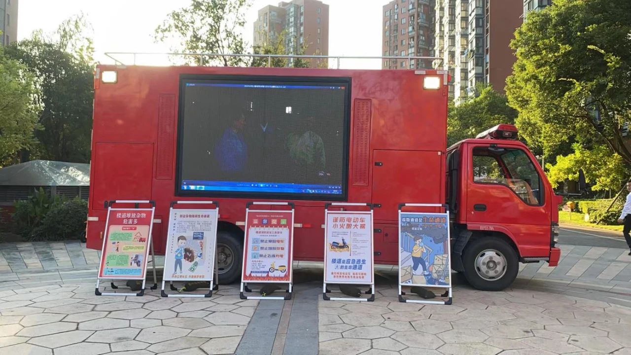 消防宣传车在乐筑良品小区中心广场上利用车载LED显示屏循环播放家庭防火宣传视频、消防公益广告和“小火亡人”警示教育片,以案说法,用最通俗易懂的表达方式向群众讲解了高层住宅小区可能存在的消防安全隐患,如遮挡消防设施、违规占用消防通道、在安全出口停放电动自行车及电瓶车私拉电线违规充电等,吸引了小区的群众驻足观看。